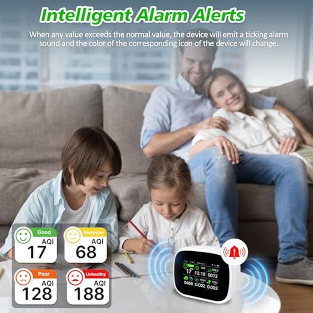 Experience unparalleled indoor air quality monitoring with our 18-in-1 Smart Air Quality Monitor, featuring cutting-edge real-time AQI, CO2, and pollutant detection. Receive instant alerts and track temperature, humidity, and time with seamless WiFi connectivity.