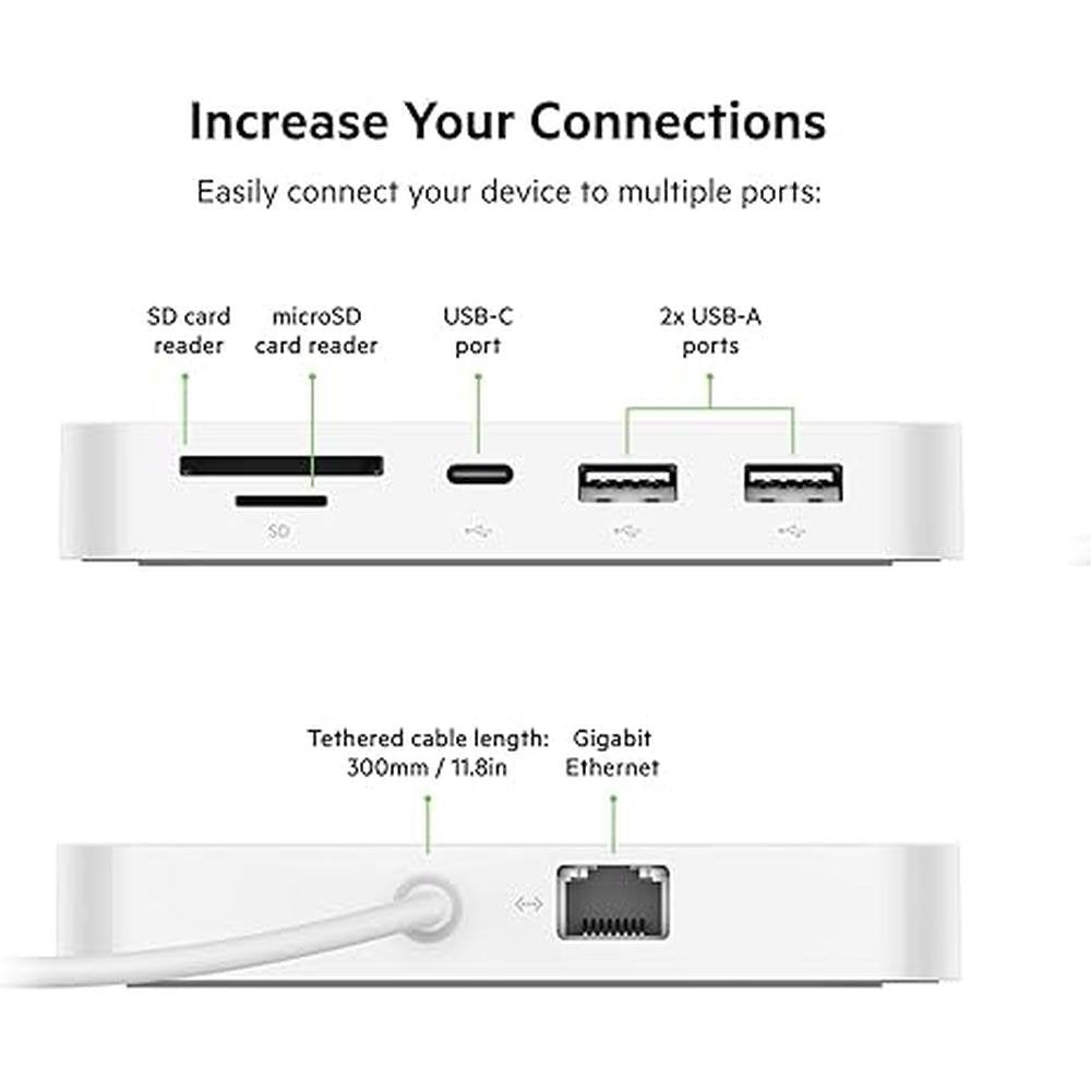 Experience the ultimate in productivity with the Belkin USB-C 6-in-1 Multiport Hub, a premium solution designed to elevate your workspace. This sophisticated USB-C docking station features a built-in microSD card reader, powered USB hub, and mounting option, making it an ideal accessory for MacBook, Chromebook, iMac, PC, and other USB-C devices. With its sleek white design, this Belkin 6-in-1 hub is perfect for streamlining your workflow and enhancing your overall computing experience.