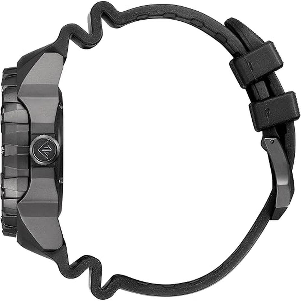It comes in an exclusive collector's black box and includes an extender strap and is ISO compliant with a screw-down crown and water resistant to 200 meters. Caliber 9051. 46mm black Super Titanium case with a screw-down crown, anti-reflective dual spherical sapphire crystal, lug width 24mm, blue dial with applied luminous accents, a date window at 3 o'clock, and a pyramid stud design. Black polyurethane strap with a buckle closure, 9051 Automatic movement powered by the release of a wound spring, mechanical movements never require a battery.
