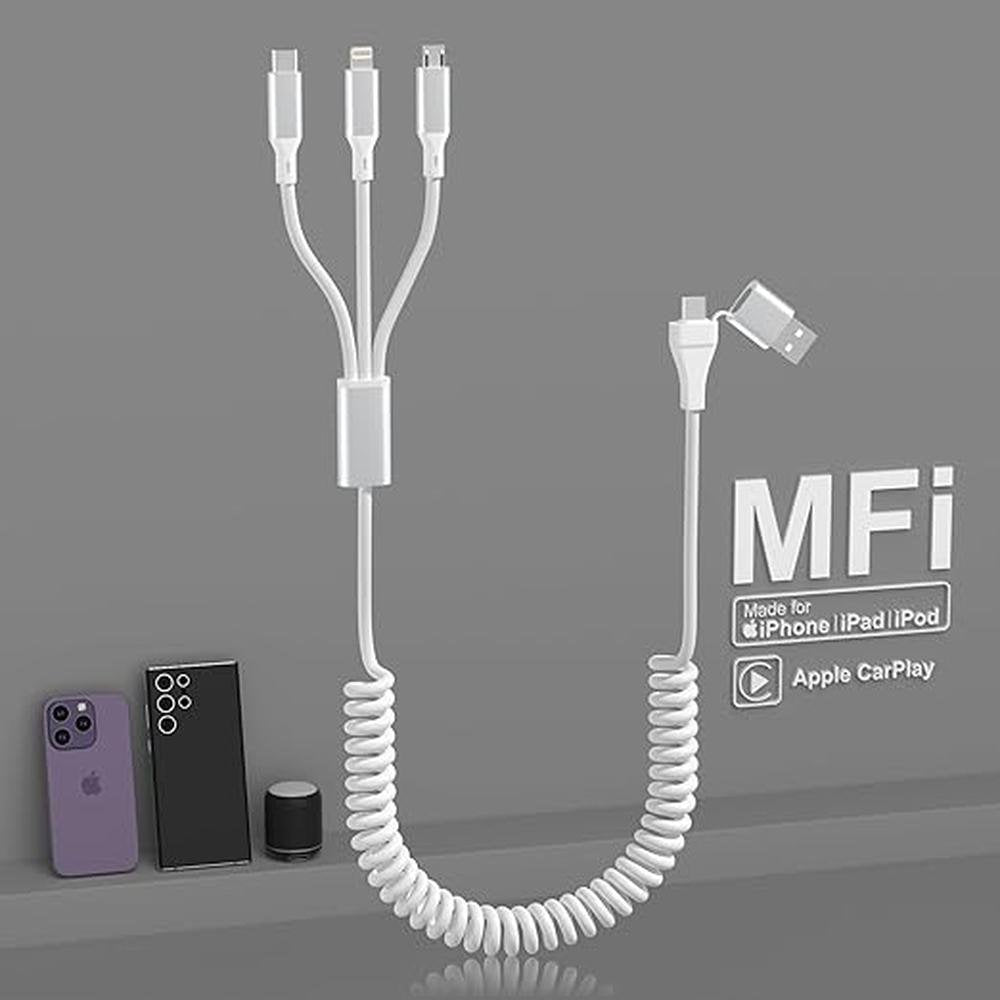 Coiled Multi Charging Cable: 5 in 1 USB A & USB C to Lightning + USB C + Micro USB Fast Charging Cord, Lightning with Data & CarPlay for iPhone 15 14 13 12 11 X 8 Series & Android Phone, White