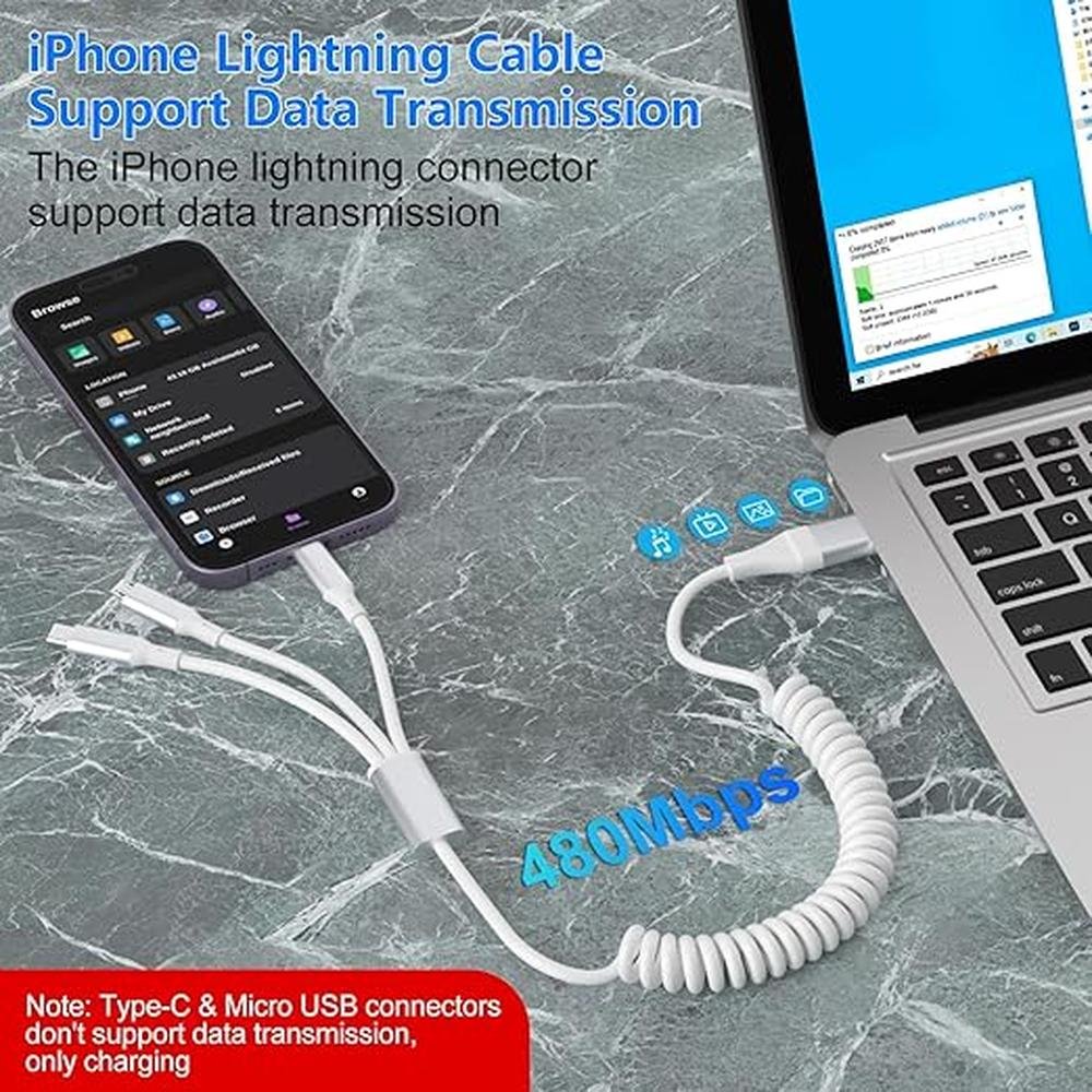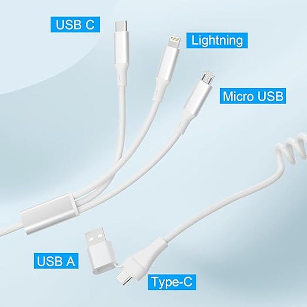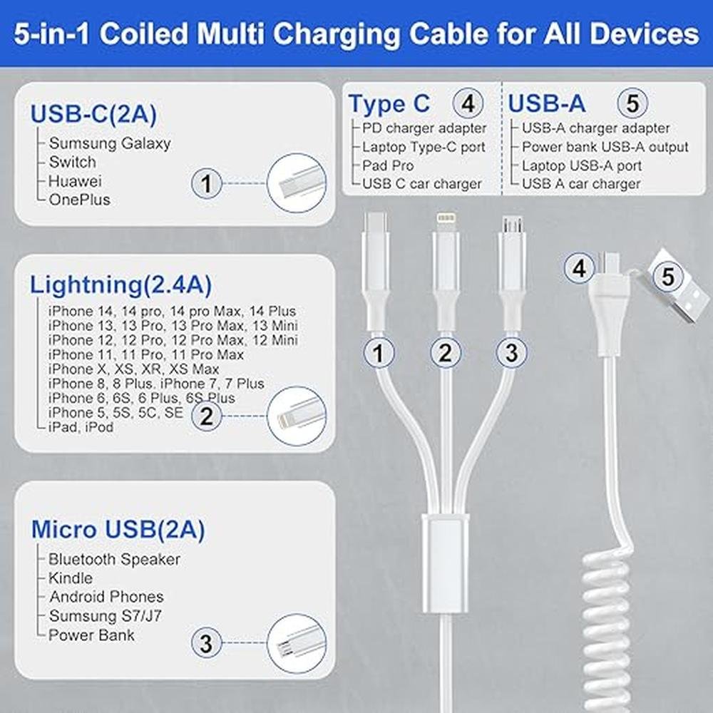 - 5-in-1 Coiled Multi Charging Cable 5 in 1 multi usb c charging cable with USB-A and USB-C 2 in 1 port and Lightning Type C Micro USB 3 in 1 connectors. This white multi devices universal phone charging cord can meet the charging needs of all iPhone, android phones and micro usb devices. Can charge 3 mobile phones at the same time