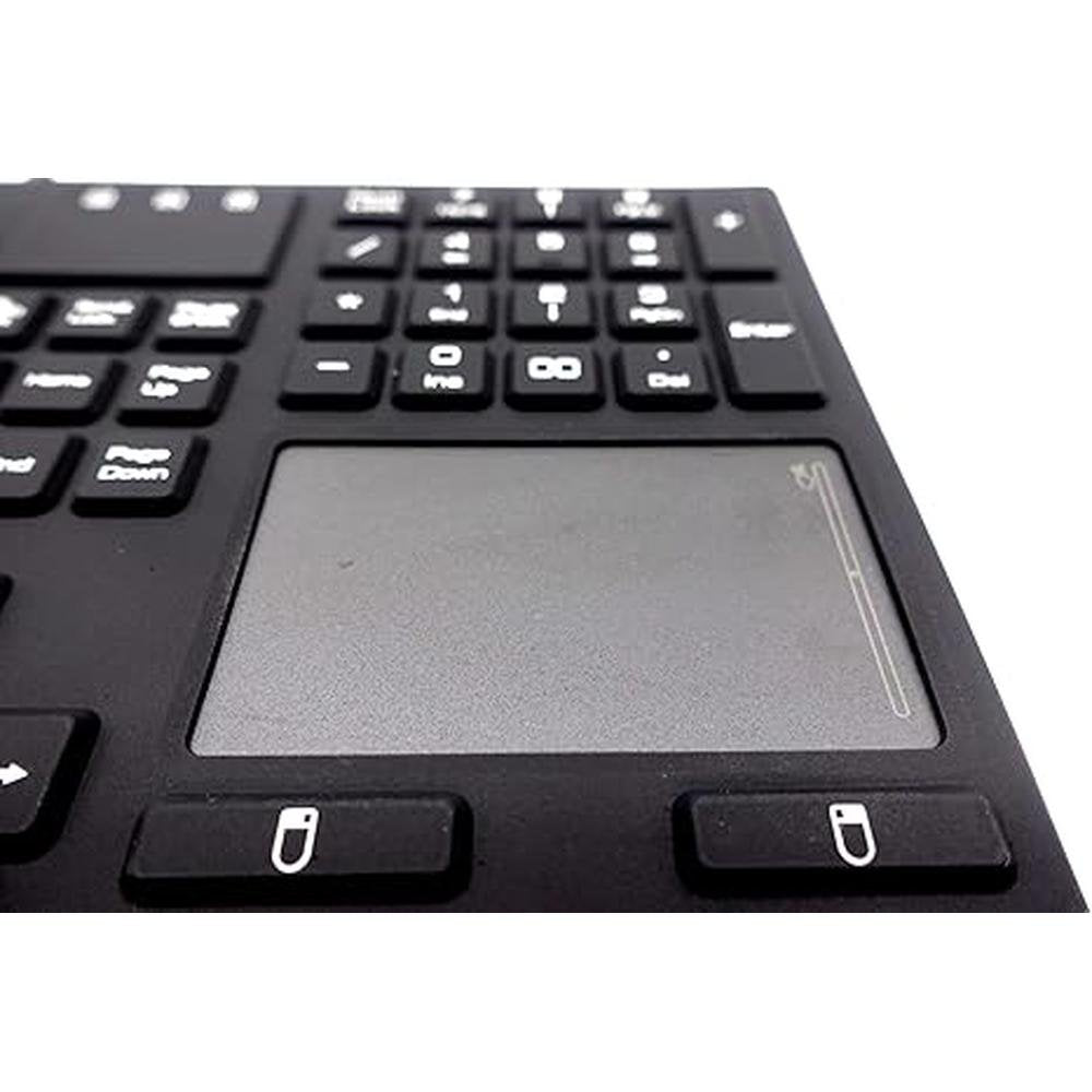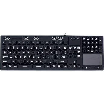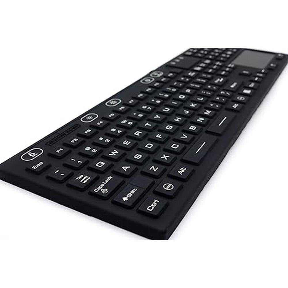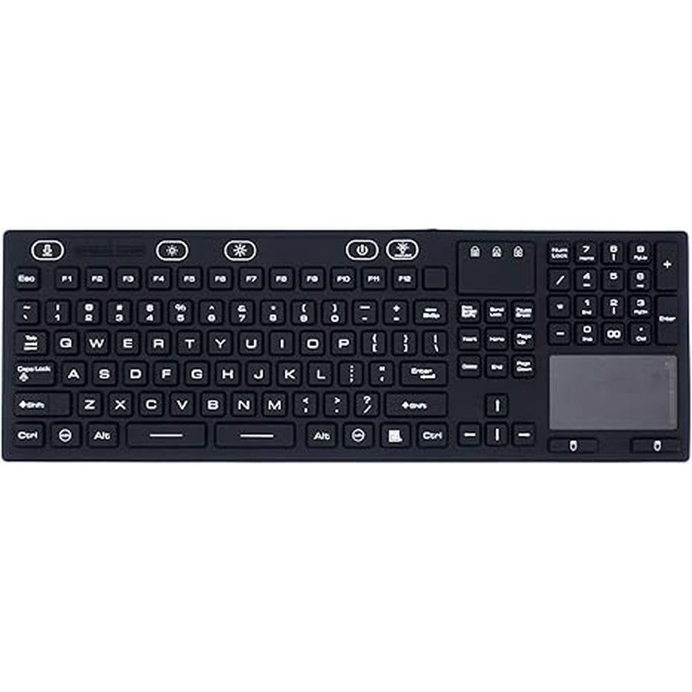 Indulge in the ultimate keyboard experience with the DSI LED Backlit Keyboard with Touchpad, model JH-IKB110BL, in sleek black. This sophisticated keyboard features a durable IP68 waterproof silicone design, ensuring it can withstand even the toughest conditions. With its advanced DSI LED backlighting, you can type with precision and clarity, even in low-light environments. The integrated touchpad provides seamless navigation, making it the perfect accessory for any computer user. Whether you're a gamer, programmer, or simply someone who values convenience, this DSI LED keyboard is the perfect choice. Its unique blend of style, functionality, and durability makes it an essential tool for anyone looking to elevate their computing experience. The keyboard has 2 step brightness of backlight and is IP68 rated for indoor/outdoor use, providing water protection and dirt resistance from the silicone make.