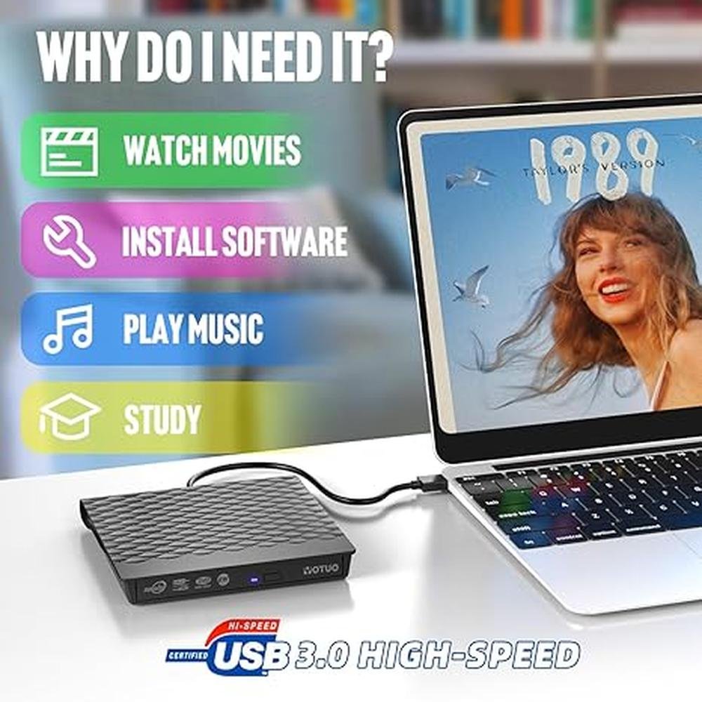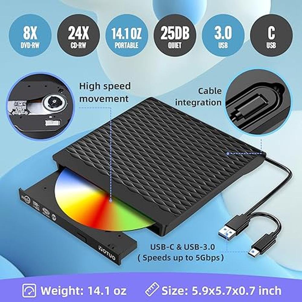 - High speedFeatures a dual USB 3.0 and Type C port. Maximum DVD reading speed of 8x maximum CD reading speed of 24x. Giving you faster data transfer speeds (up to 5Gbps), play music and movies without lag or distortion.