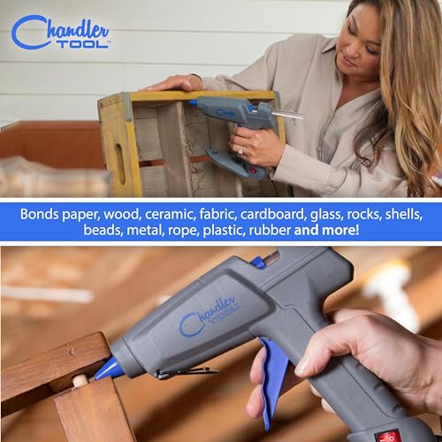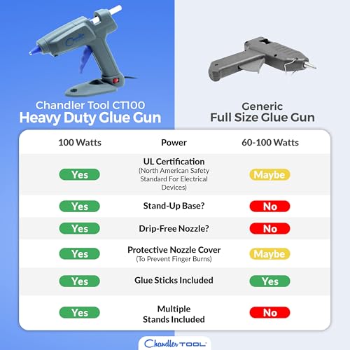 Why should I buy the Chandler Tool CT60 Stand up Glue Gun? Once you experience the ease and convenience of our stand-up base, you’ll wonder how you survived without it! No more tipping and no need for an extra glue gun holder. This electronically operated heavy duty glue gun has the power of a jumbo glue gun and will never run out of battery, unlike cordless, wireless, or mini glue guns, making this a great option for professional industrial use in addition to precision detail crafts. Although the CT60 with glue sticks hot glue packs a punch, it is still small and lightweight enough to be a great kid friendly option (with adult supervision). It's perfect for everything from delicate projects like arts and crafts, floral designs, and hair wig making, to electronics work, to home repairs using materials such as PVC, wood, glass, or metal. In addition to being extremely versatile, our hot melt glue gun is the gold standard of glue gun quality. With a body made from top-quality impact-resistant plastic and an all-metal precision heating element, this just might be the last glue gun you buy. A defective glue gun is both an electrical hazard and a fire hazard! Beware CE-certified (Europe-only) & non-certified (yikes!) glue guns. UL-certification is the safety standard for products sold & used in North America. UL certification is very expensive & manufacturers are proud to display it, so if a product doesn’t list it you can be sure it doesn’t have it. Unlike most hot glue guns sold online, the CT60 is fully UL-certified. Who is Chandler Tool? Born out of frustration with low quality throw-away tools, Chandler Tool was founded with a single purpose: to create high quality tools that last a lifetime. Though many of our products are produced overseas, we are an American company, building tools to American standards for American customers. Buy with confidence. We stand by our products with American customer service and a lifetime warranty.
