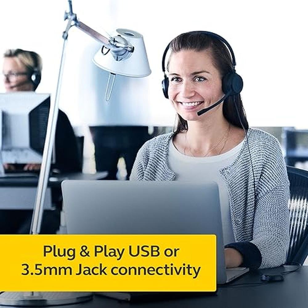 - ALL-DAY COMFORT Built for style and comfort with leather-feel ear cushions and around-the-ear design, this work headset is ready for comfortable, all-day use.