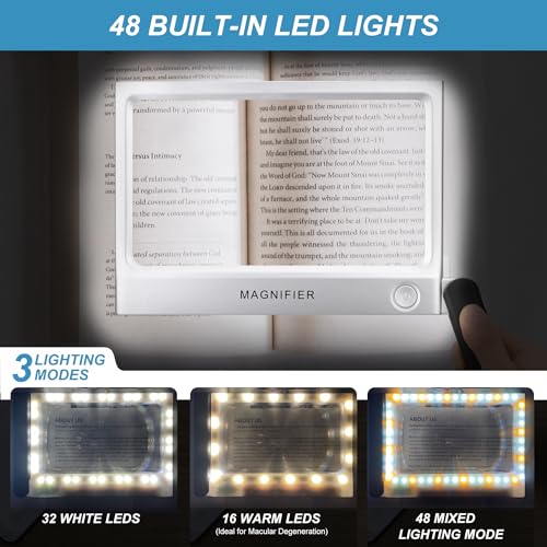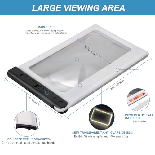 - 48 LED Lights with 3 Lighting Modes When using this extra large magnifying glass for reading, you can adjust the lightness of a 5X magnifier according to different situations. It features 48 LED lights (36 cold LED lights and 12 warm LED lights) with 3 modes (cold, warm mixed) for you to choose from, providing you with bright and even illumination, and no glare, so you can freely enjoy your reading at night. 3 AAA batteries are required for LED lighting modes (batteries not included).