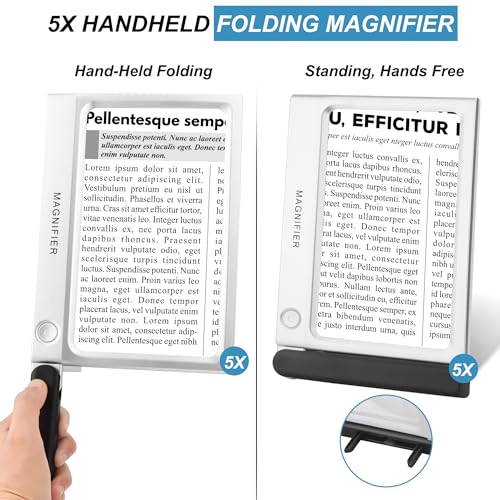 - Full-Page 5X Magnifying Glass Specially designed rectangle shape of this magnifying glass with light can provide you with a better reading experience when reading books, newspapers magazines, or other papers, Extra large magnifying lens allows it to cover most parts of books so you don t need to move magnifier a lot. This magnifying glass for reading provides 5X magnification without distortion, perfect for avid readers.