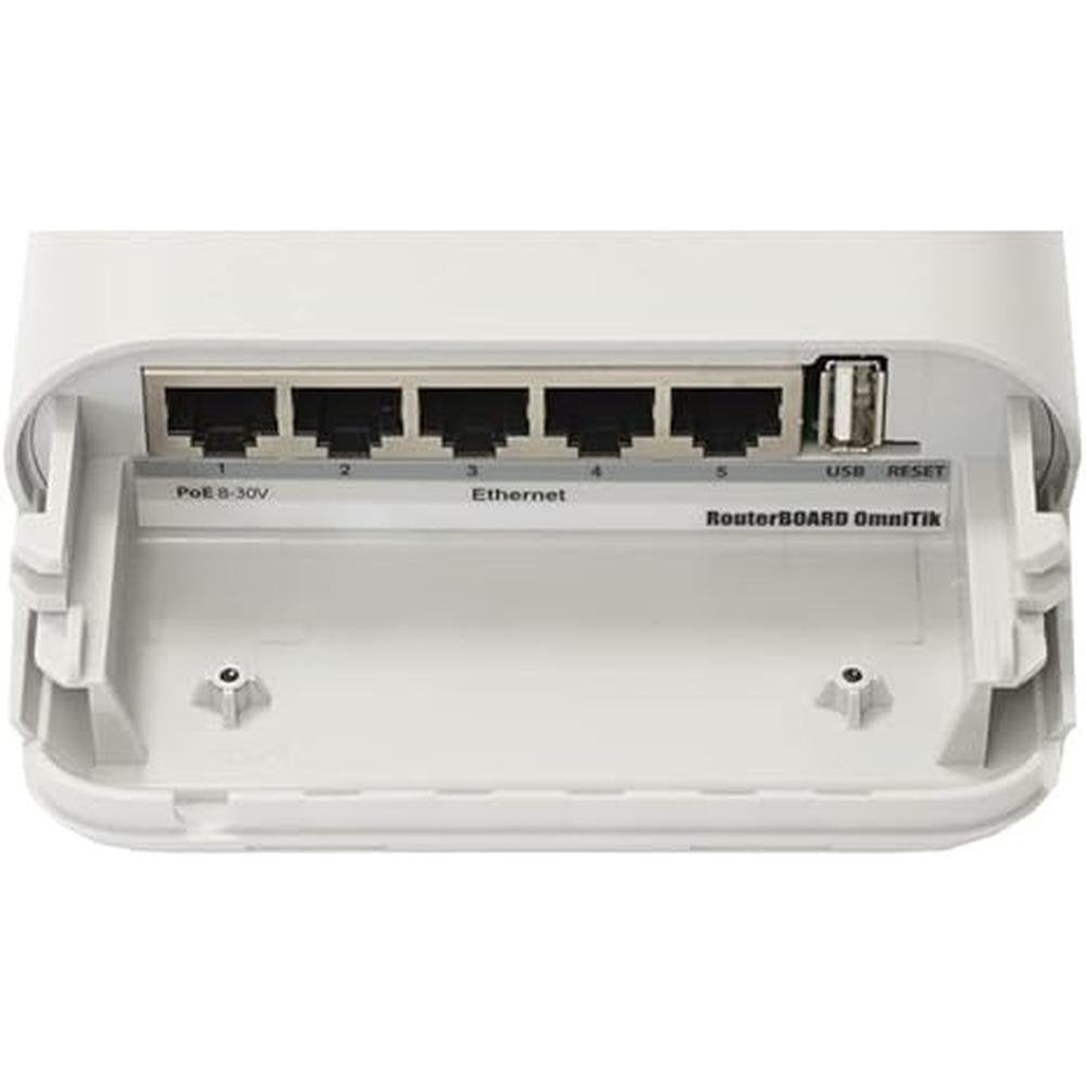 SKU RBOmniTikUPA-5HnD Mikrotik OmniTIK 5 PoE OmniTIK is a weatherproof outdoor AP with dual-polarized omni antennas - the perfect companion for our SXT, or for any other 5GHz 802.11an standard device. Weatherproof, durable and ready to use. It has ve 10100 Ethernet ports, PoE support and a built-in 1000mW 802.11an wireless radio. It supports Nv2 TDMA technology with up to 200Mbit aggregate throughput. LED signal indicators on its back are fully customizable, show Ethernet activity or wireless signal - or any other information from RouterOS. The USB port gives the ability to connect a 3G modem or a storage drive. The OmniTIK UPA also features power output on its ethernet ports. Ports 2-5 can power other PoE capable devices with the same voltage as applied to the unit. Less power adapters to worry about. Box contains OmniTik UPA-5HnD, mounting loops, PoE injector, 24v 2.5A power adapter.