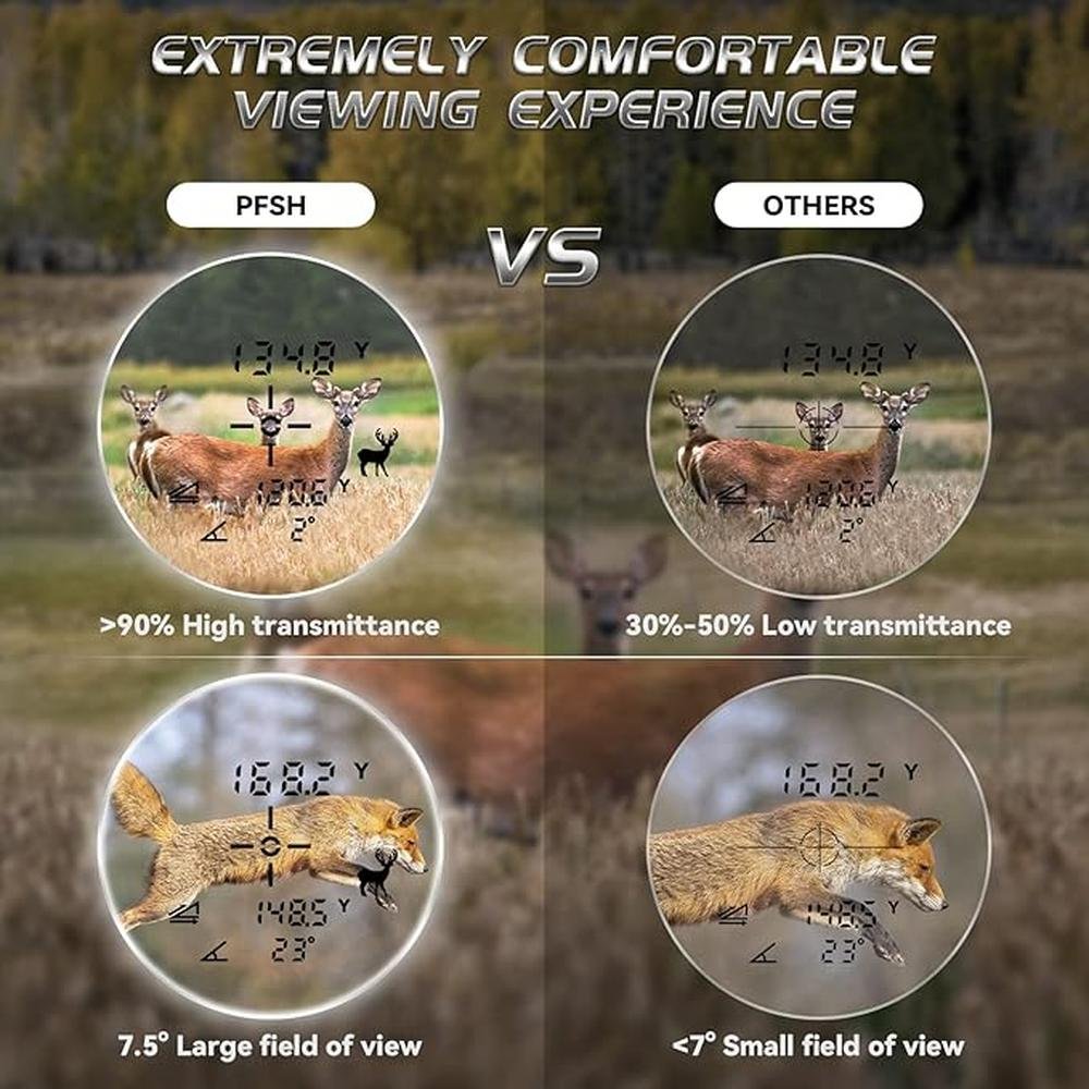 - Wide Field View of 7.5, All-Glass Optical System, Fully Multi-Coated Lenses, along with Adjustable Diopter, PFSH Hunting Range Finder has the ultra wide view and extra clarity. Imagine, seeing your target clearly from a distance of 5-1100 yards and quickly observing and aiming at them