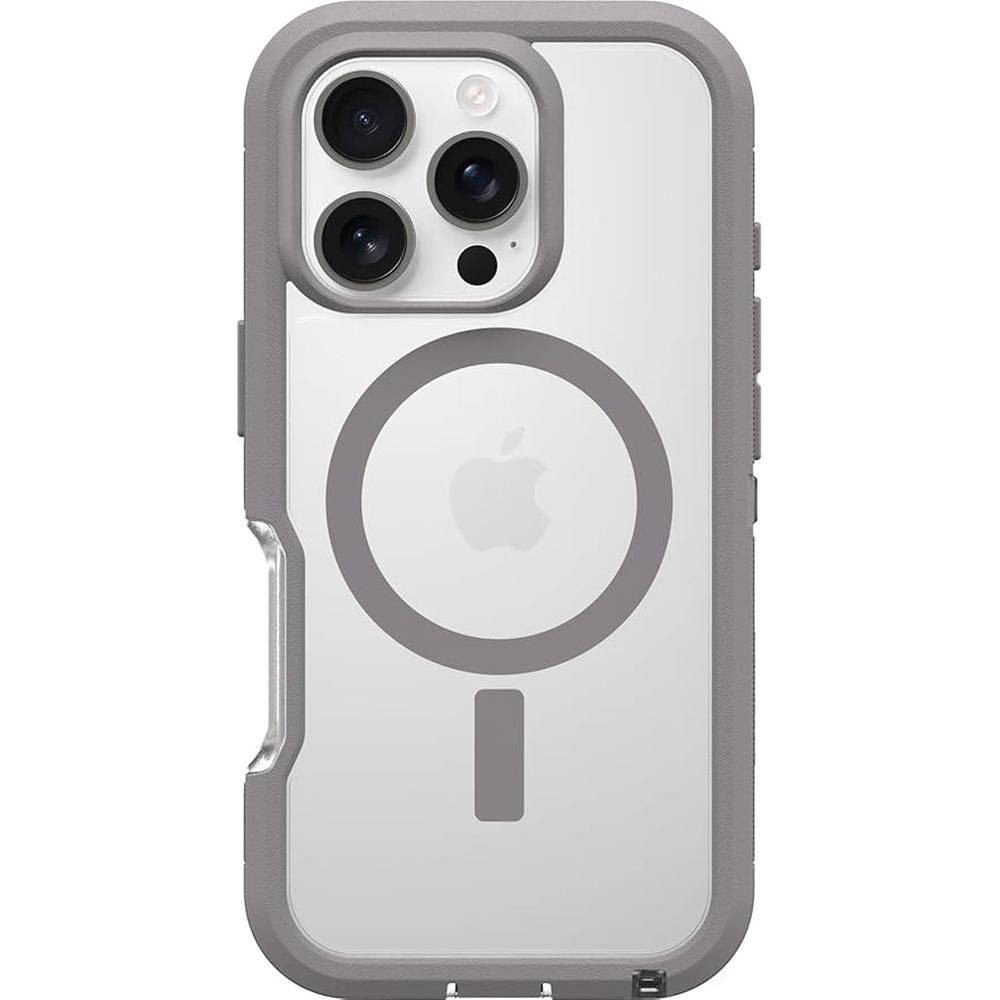 For legendary Defender Series protection in a sleek, see-through package, get Defender Series XT for MagSafe. Built to 7X military standard drop defenses, it survived 182 drop tests before we released it. It features a thinner, dual-layer design with a pressure-fitted frame that keeps your device securely in place and a secure grip. Built-in magnets snap to MagSafe chargers and accessories, and integrated anchors give you extra ways to carry your case. Plus, this MagSafe iPhone 16 Pro case has raised edges for added camera and screen defense. Specifications Compatible With iPhone 16 Pro Drop Height DROP 7X as many drops as military standard (MIL-STD-810G 516.6) Dimensions 6.32 x 3.32 x 0.60 in 16.06 x 8.42 x 1.52 cm Weight 0.17 lb 78.42 g Materials Thermoplastic Elastomer slipcover Polycarbonate Layer MagSafe Case Features DROP 7X as many drops as military standard (MIL-STD-810G 516.6) Protective dual-layer design keeps phone securely in place with a pressure-fitted frame Built rugged yet thin with grippable rubber edges for secure carry shock absorption Bumpers around the camera protect against hard hits Screen lip keeps display hovering safely off surfaces Port cover block dust and dirt Clear design puts your device on display without sacrifice protection Integrated magnets snap firmly to MagSafe chargers and accessories Built-in anchors let you connect phone straps and charms Works with OtterBox screen protectors Defender Series XT contains a minimum of 45 recycled content, consisting of 100 recycled plastics