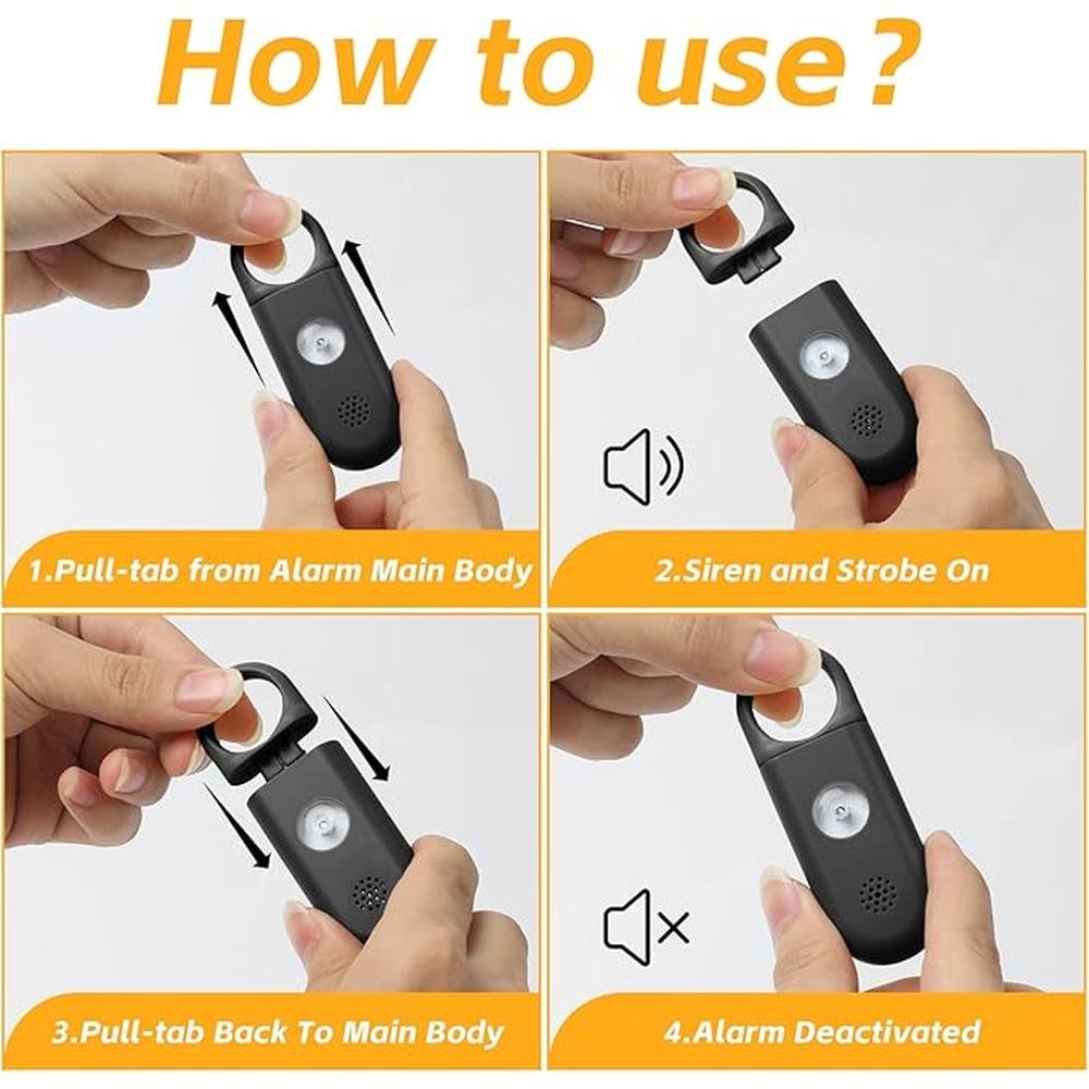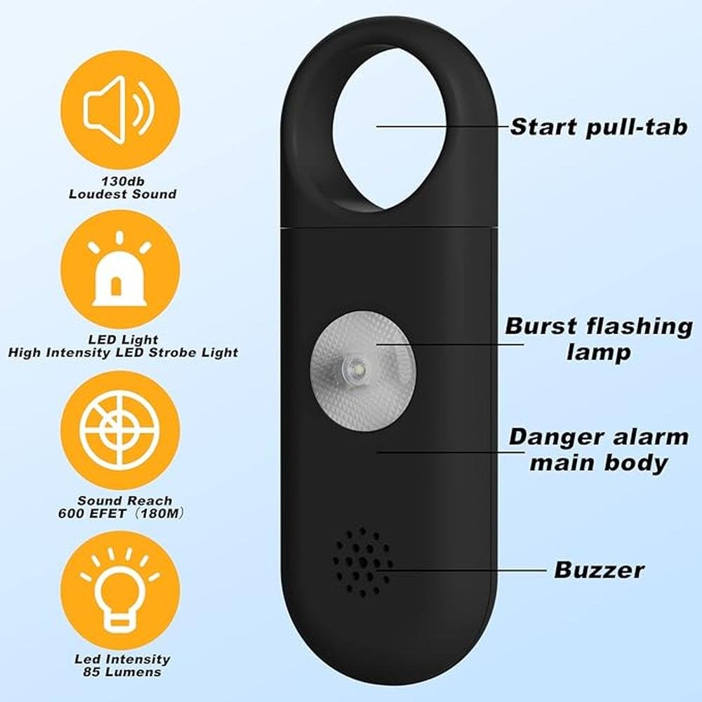 130 db super loud alarm sound, Draw others attention even in a far distance. When faced with danger, turn on the alarm to quickly attract attention and ask for help With LED lights that can help you in the dark, suitable for outdoor activities such as hiking, camping and climbing Compact keychain, easy to carry around, you can attach the safety alarm to purse, belts, jackets, keychain, backpack, ladies bag and etc. take it with you even when you are on a plane Specifications Working duration100min Buzzer volume130db Size3.541.220.59 Net weight44.2g Features Up to 130dB Speakers and Powerful strobe light Draws the Attention of Passers, Confusing attackers saves you valuable time Products include Danger Alarm Main body1 Mountaineering Buckle1 Manual1. Kindly Note 1.The product shall be installed and used away from heat sources, such as range hood, heater outlet, and direct sunlight 2.Please use soft cotton cloth when clean the product surface 3.Please do not use this product as a toy for children to avoid accidents 4.The LED module cannot be replaced,please do not disassemble the product without permission 5.The burst flashing lamp will produce high frequency strong light when turn it on, Please do not look directly to avoid vision damage 6.The product will produce high decibel noise when working, please keep the product away from your ears to avoid hearing damage 7.Do not use for fun or mischief