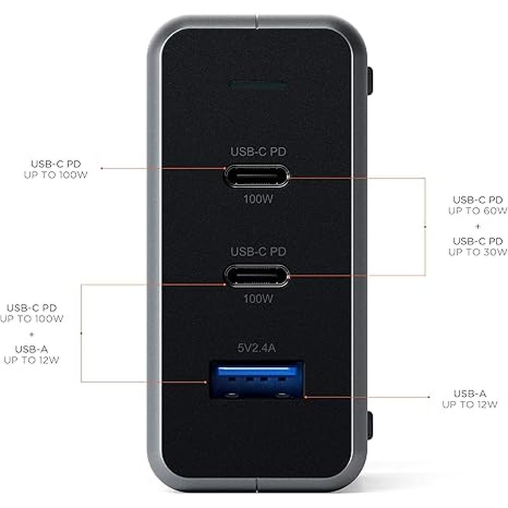 - Simultaneous Fast-Charging - In addition to the USB C ports, this multiport charging station includes an extra USB A port, allowing you to power up to three devices simultaneously. The charger adjusts its power output according to the connected devices, delivering optimal charging speeds of up to 100W, 60W30W, or 60W30W12W.