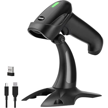 Experience the convenience of wireless scanning with the Symcode Wireless Barcode Scanner with Stand, a 2-in-1 device that combines 2.4GHz wireless and USB 2.0 wired connectivity for seamless barcode reading. As a leading provider of innovative scanning solutions, Symcode offers a range of high-quality barcode scanners, including the popular Symcode Barcode Scanner MJ 2030. This rechargeable cordless 1D barcode reader is designed to streamline your workflow, whether you're managing inventory, tracking assets, or processing transactions. With its user-friendly design and comprehensive Symcode barcode scanner manual available for easy reference, this device is perfect for enhancing productivity and efficiency. Note For Android devices without standard USB interface like Samsung Galaxy i9300 S3, S4, S5, Nexus 4, Nexus 5, Nexus 6, Nexus 10, an Extra OTG Adapter is needed. The scanner supports FEDEX USPS tracking number. Add Prefix and Suffix feature, you can add characters in front and after each scan. Specifications - Supported Codes Codabar, Code 11, Code 93, MSI, Code 128, UCCEAN-128, Code 39, EAN-8, EAN-13, UPC-A, Industrial 25, Interleaved 25, Standard 25, 25 Matrix - Support Keyboard language English French German Spanish Italian - Compatible Operating Systems Windows XP Vista 7 8 8.1 10 Wince Mobile Android devices - Wireless Communication 2.4G wireless transmission - Scanning Angles Fanning 30º Horizontal 75º Vertikal 65º - Scanning depth of field 0-350mm (0.43mm, PCS 98) - Nominal Working Distance 630cm, Scan Width 30mm - Scan Mode Auto off mode Manual mode - Light Source (Laser) Laser LED 650-20nm - Battery 1800mAh lithium battery - Robust design Designed to survive free fall height of 1.50 m - Light source Visible lasing diode Wave length 650nm - Scanning mode Bi-directional single line scanning Package Includes - 1 2.4G Wireless Laser Scanner - 1 USB Charging Cable - 1 2.4G USB Receiver - 1 Manual