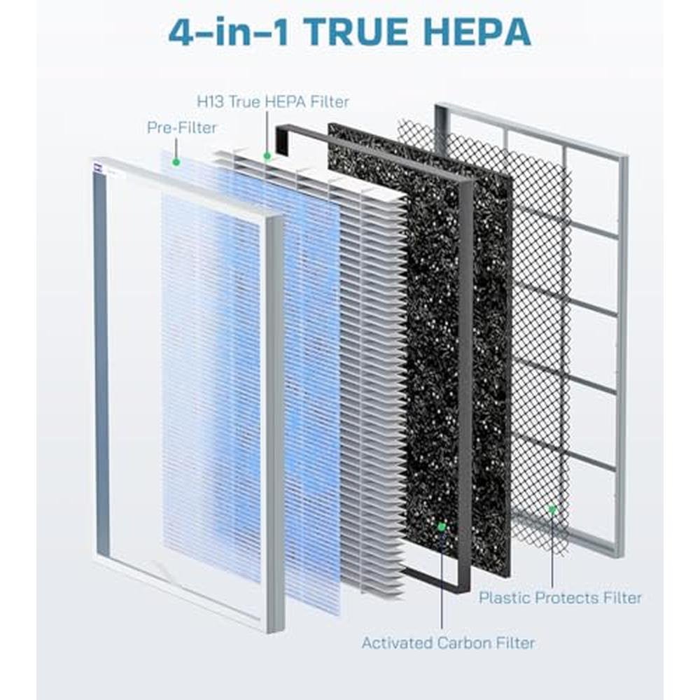 - Our 4-in-1 H13 True HEPA Filter captures 99.97% of particles as small as 0.3 microns, including dust, pollen, and pet dander