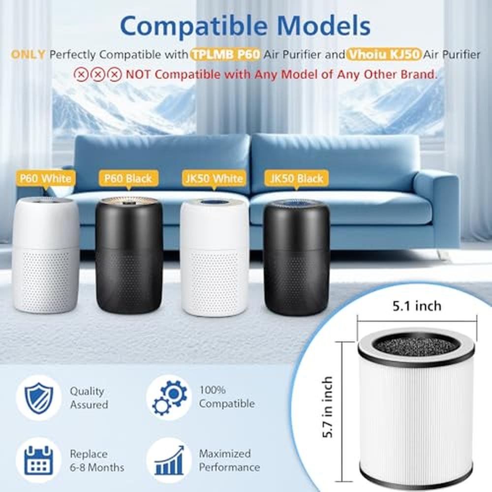 Filter P60 | 4-Pack Replacement Filter for TPLMB/YARIKI P60 and Vhoiu KJ50 Air Purifiers | 3-in-1 HEPA Filter with High-Efficiency Carbon and Nylon Pre-Filter
