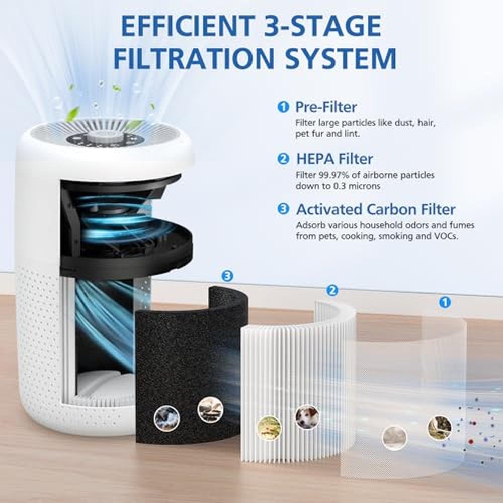 • 3-in-1 filtration system with nylon pre-filter, HEPA filter, and high-efficiency activated carbon filter for comprehensive air purification