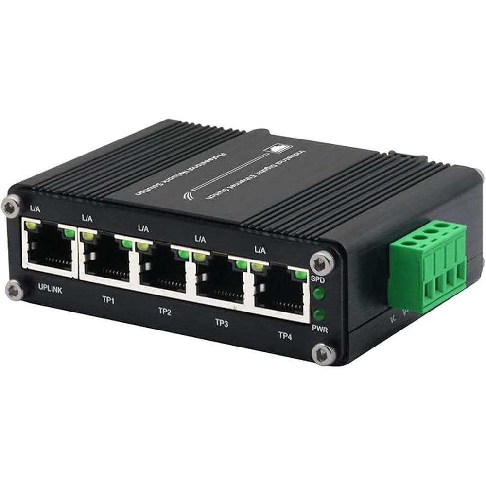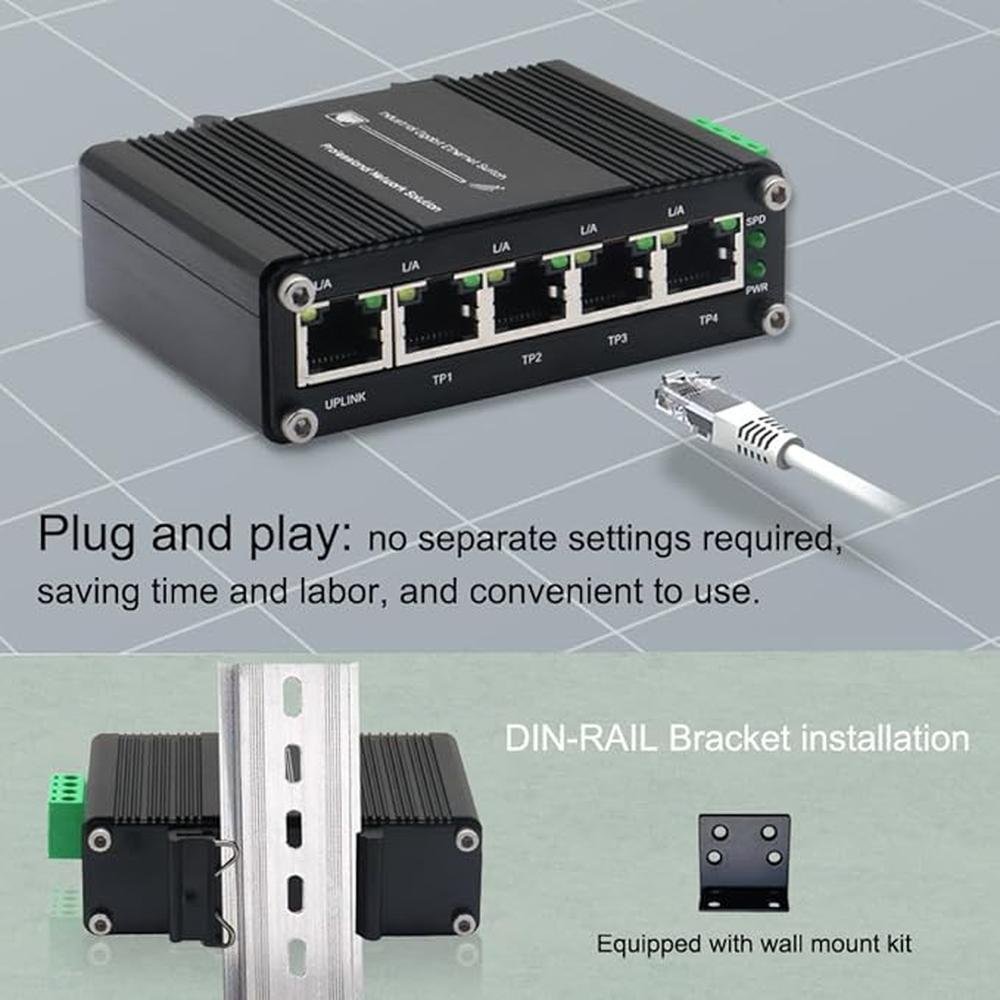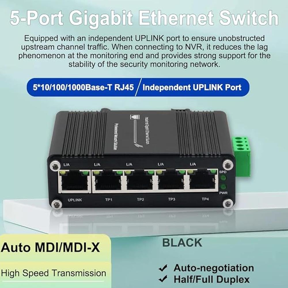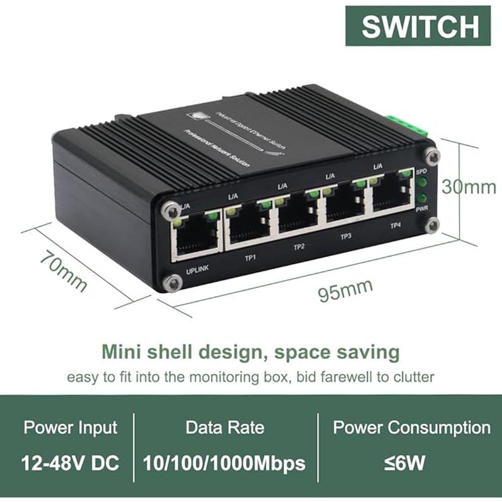 Mini 5-Port Gigabit Ethernet Switch - Industrial-Grade Unmanaged Network Switch with 12-48VDC Power Input, Din-Rail or Wall Mount,Fast Connection,Plug and Play, Rugged Metal Case