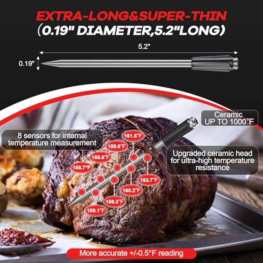 • The 800ft wireless capability allows for effortless monitoring from a distance, while the ultra-thin probes provide precise temperature readings