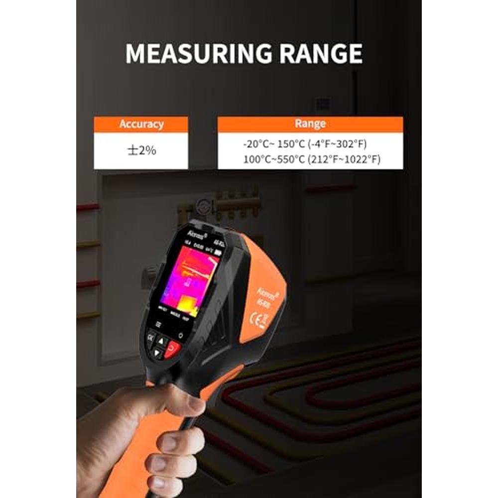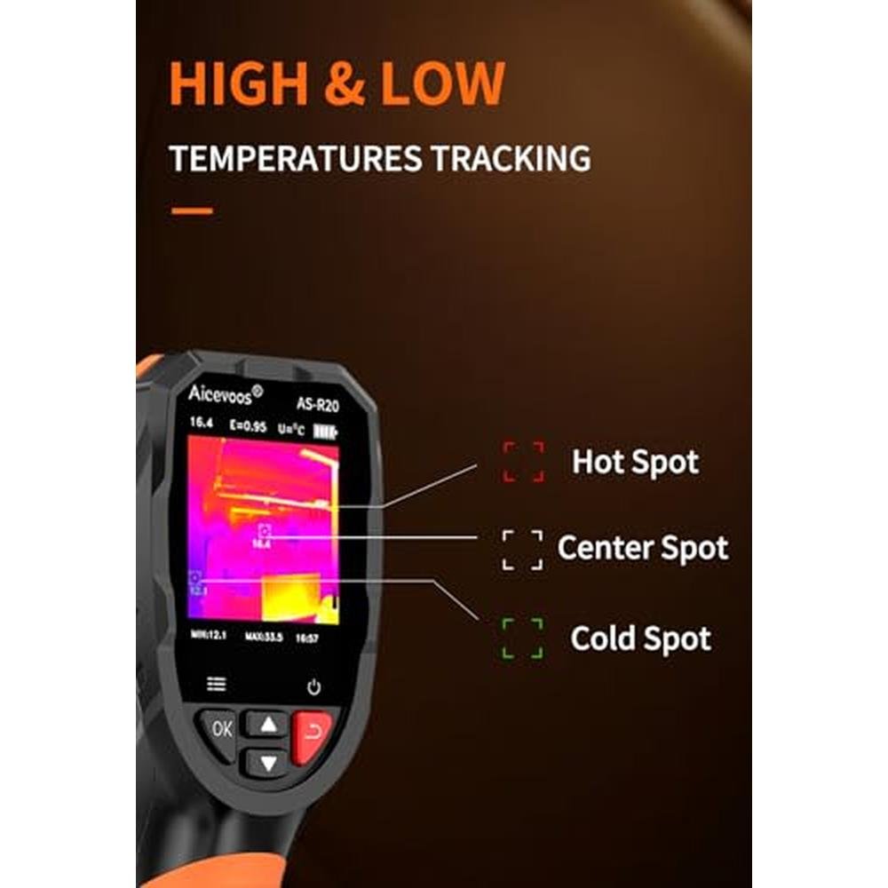 Experience the pinnacle of thermal imaging technology with the Aicevoos R20 Handheld Thermal Camera, a premium-grade thermal imaging camera designed for precise temperature detection and superior image quality. With its advanced super resolution of 240 x 240 and 96 x 96 IR resolution, this high-end thermal camera provides detailed thermal images, making it an ideal tool for various applications, including thermal camera for home inspection, thermal camera for hunting, and industrial inspections. The Aicevoos R20 features a laser pointer for accurate targeting, a 25 Hz infrared camera for real-time imaging, and a wide temperature range of -4°F to 1022°F. Its 50° field of view (FOV) allows for comprehensive thermal imaging. The built-in rechargeable battery provides up to 3 hours of continuous operation, while the built-in flash memory can store approximately 30,000 standard thermal images. The 6.6ft drop test and IP54 protection rating enable you to work with confidence in most different work scenarios and even harsh environments. Designed with a standard tripod hole, the R20 thermographic camera supports using a tripod to assist inspection works.
