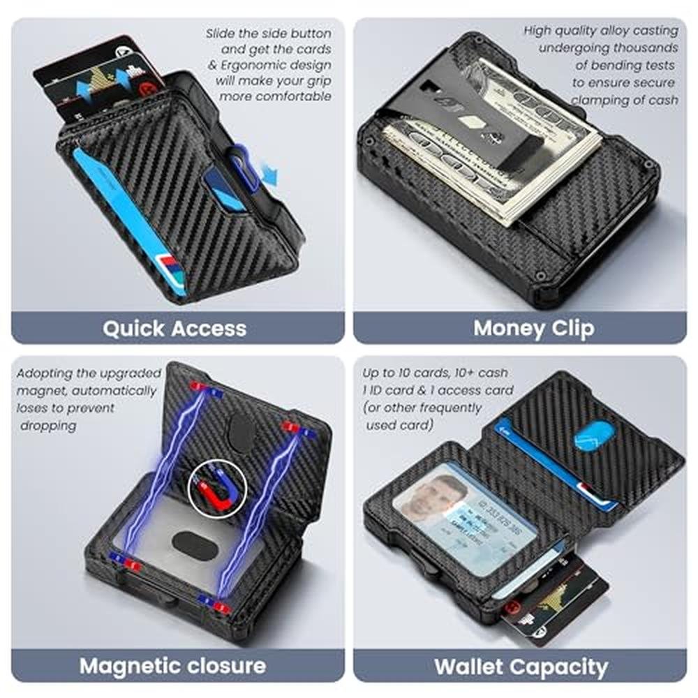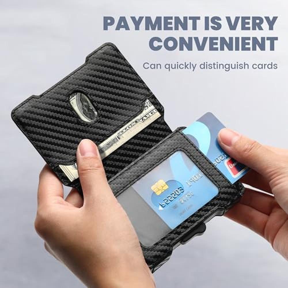• [MILITARY-GRADE MATERIALS]: Crafted from waterproof leather and carbon fiber shell, our wallet exudes both elegance and durability. The aluminum alloy pop-up case keeps your cards protected without adding bulk, while the reinforced button undergoes thousands of presses to guarantee top-notch quality. This is one tough wallet that's ready for any adventure!