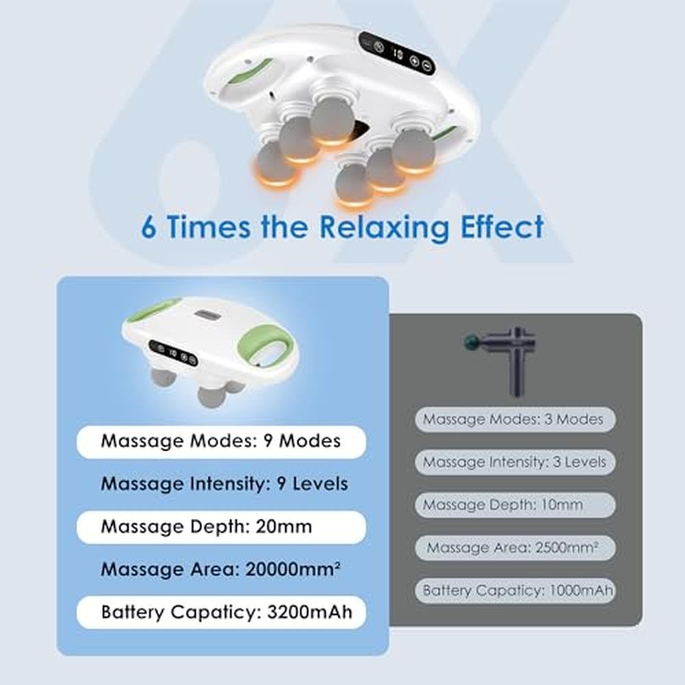 - The APXPF 6 Head Massage Gun features 9 levels of intensity and 9 modes to customize your massage experience, providing a personalized approach to pain relief and relaxation.