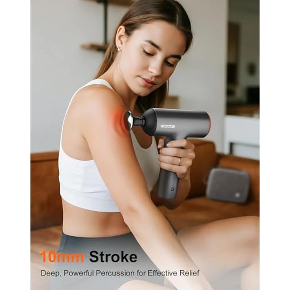Experience the versatility of the Arboleaf Thermal Massage Gun, designed for deep tissue muscle recovery and relaxation. Featuring a heated massage head, it delivers soothing heat to relax tight muscles and improve overall comfort. Ideal for athletes, fitness enthusiasts, and anyone experiencing muscle tension, this electric massager helps promote relaxation and improve muscle comfort. The powerful brushless motor provides 3000 RPM and a 10mm stroke, ensuring deep penetration for muscle relaxation. With 6 interchangeable heads, it offers a customized massage experience for different muscle groups, targeting large areas like the back or more delicate spots like the neck and shoulders.