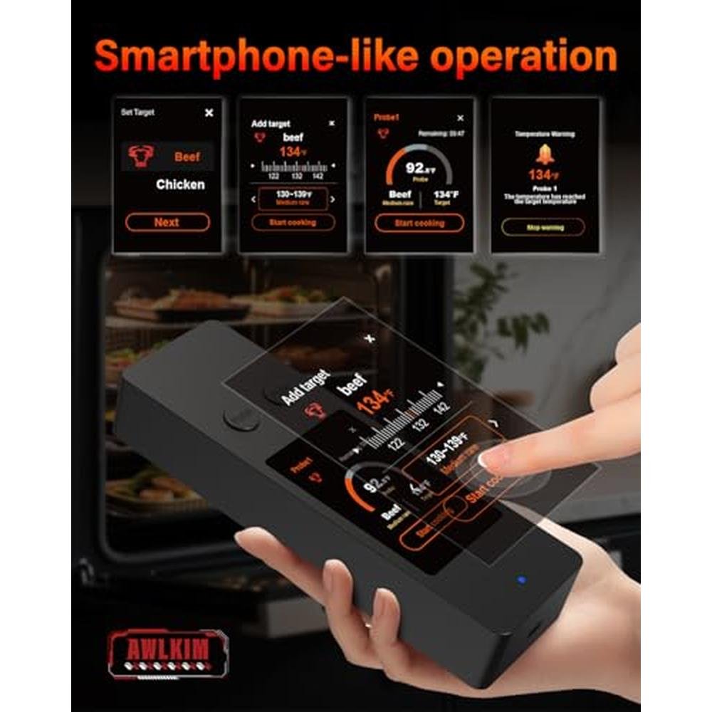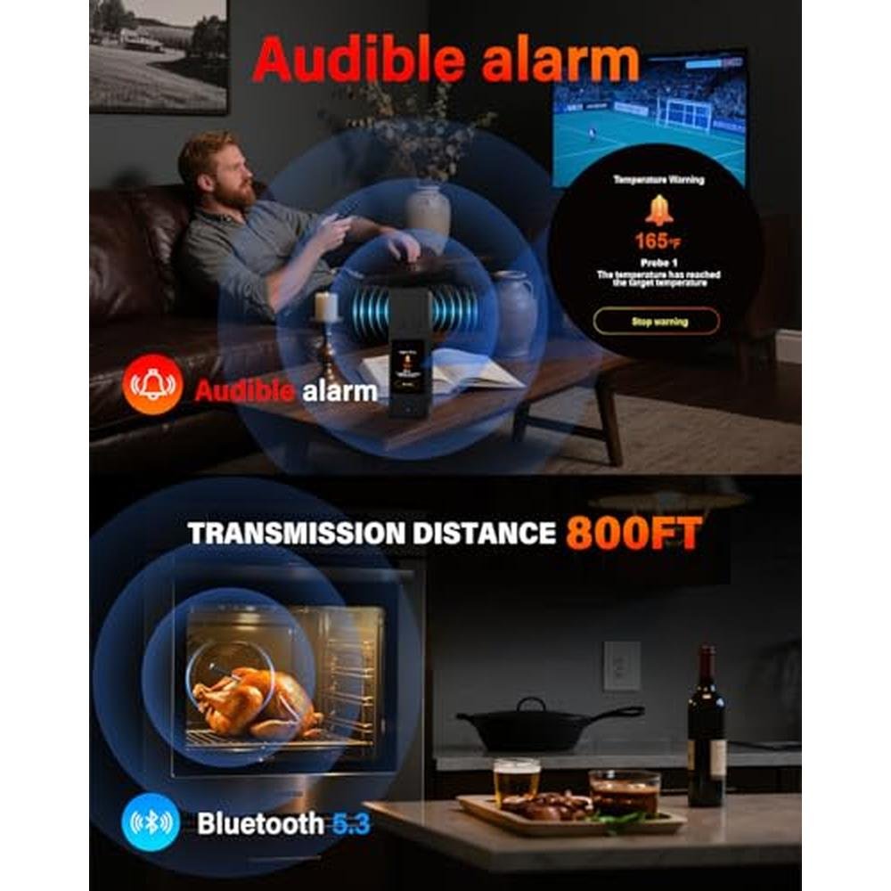 - Features a touch screen interface, audible alarm, and 2 probes for simultaneous temperature monitoring, with a long-range 800ft connection and rechargeable base