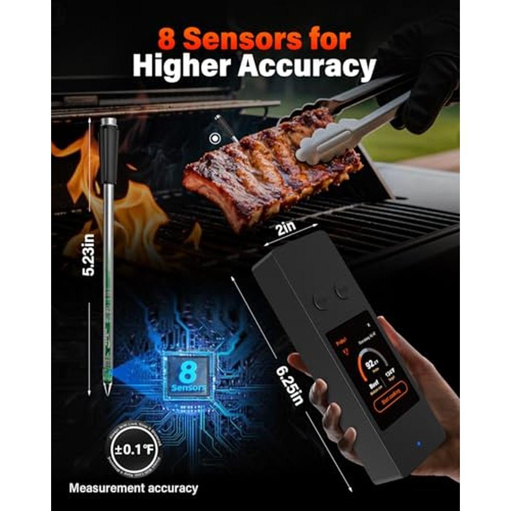 Experience the ultimate in cooking convenience with our Bluetooth Wireless Meat Thermometer, designed to make BBQ, smoking, and kitchen cooking a breeze. As one of the best Bluetooth thermometers for smokers and grill masters, this device features a touch screen interface, audible alarm, and 2 probes for simultaneous temperature monitoring. With a long-range 800ft connection and rechargeable base, you can effortlessly track your meat's temperature using our dedicated app, compatible with both Android and iOS devices, including iPhone. Whether you're a seasoned pitmaster or a beginner, our Bluetooth meat thermometer is the perfect tool for achieving perfectly cooked meals every time. Learn how a Bluetooth meat thermometer works and discover the secret to tender, juicy meats with our innovative device. Smart Wireless Cook by temperature, not by guesswork, with our precision sensor delivering quick, confident feedback that feels instant read, with fine 0.1F resolution across 32-212F. Switch F/C anytime and enjoy restaurant-level consistency with less checking and more enjoying.