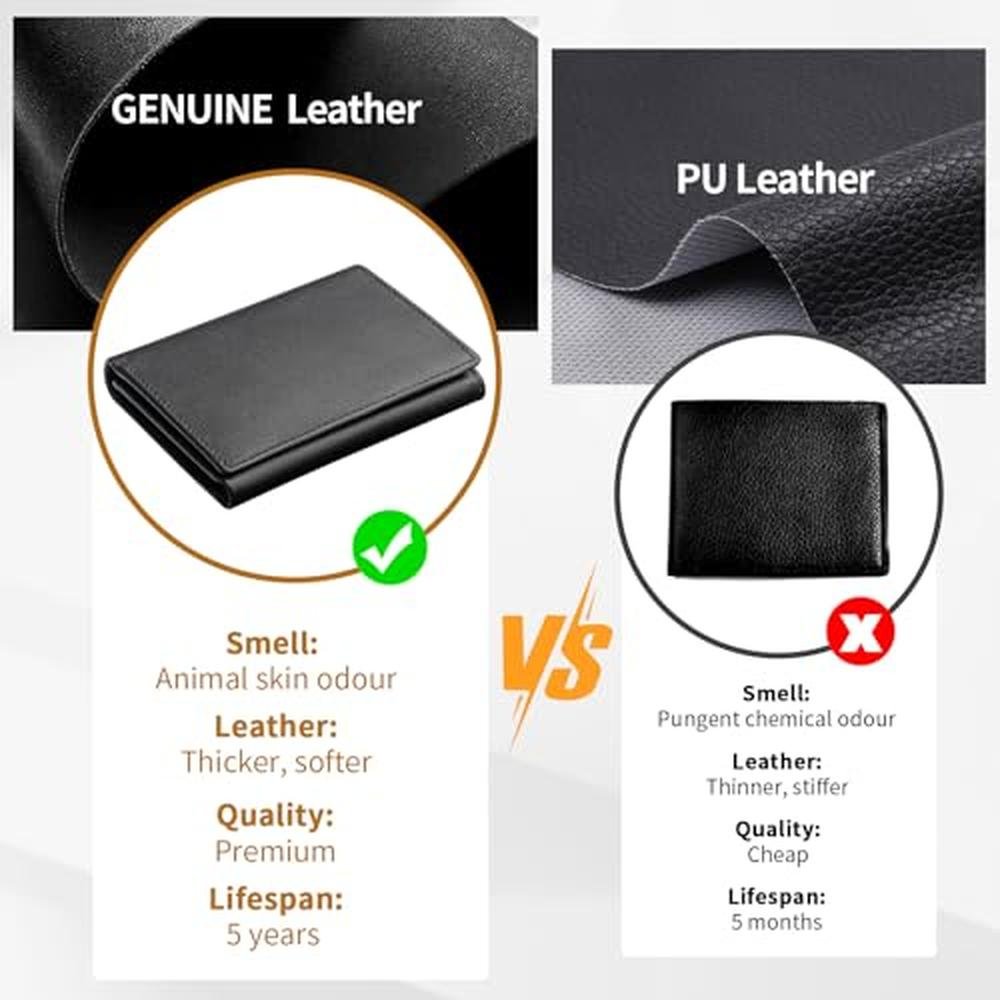 - Superior Quality Leather : We have selected first layer cowhide with good natural characteristics, along with clear leather texture, uniform color, soft and smooth feeling. It has good toughness, precision stitching and durability. Top craftsmanship adds sophistication to the wallet. Normally, new genuine leather wallet is slightly stiffer, but over time wallets will become softer, with a more flexible slot