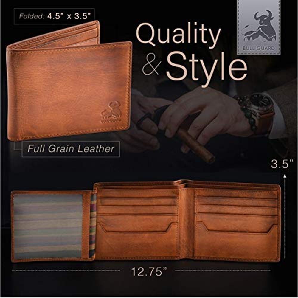 BULL GUARD RFID Blocking Bifold Wallets for Men, Brown Full Grain Leather Credit Card Wallet with 2 ID Windows Premium Security and High Capacity