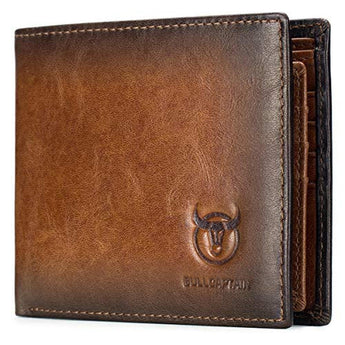 BULLCAPTAIN RFID Wallets for Men Slim Bifold Genuine Leather Front Pocket Wallet with 2 ID Windows QB-05 (Brown)