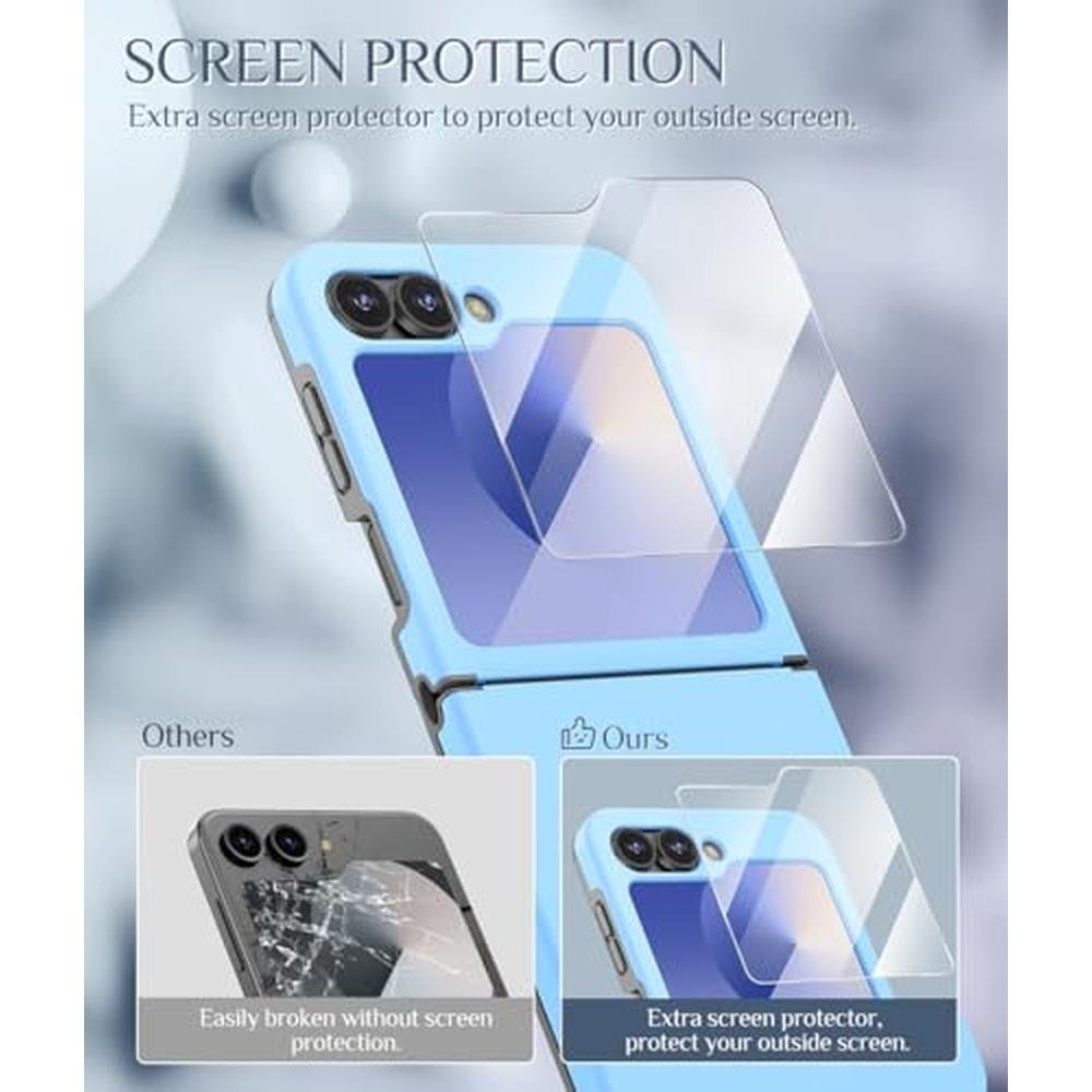 This upgraded protective Samsung Galaxy Z Flip 7 FE & Z Flip 6 & Z Flip 5 case by Caka is engineered to meet the demands of modern foldable phone users, delivering a precise fit, enhanced durability, and reliable coverage from hinge to screen. Crafted with a dual-layer structure, combining a rigid PC shell with a shock-absorbing TPU inner lining, this case ensures your Galaxy Z Flip 7fe / 6 / 5 is protected from accidental drops, scratches, and daily wear and tear. An extra screen protector is included to shield your display from scratches and smudges, delivering comprehensive protection without compromising usability.