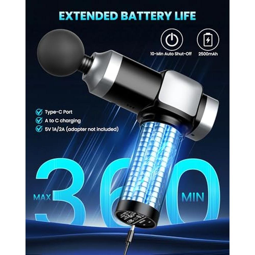 | SKU | BMExtended Use, Effortless ChargingThe handheld massage gun features a built-in 2500mAh rechargeable battery that supports 300500 full charge cycles. Enjoy 240360 minutes of continuous use per charge (depending on speed level). A versatile Type-C charging port supports A to C cables, making it easy to recharge anytime, anywhere |