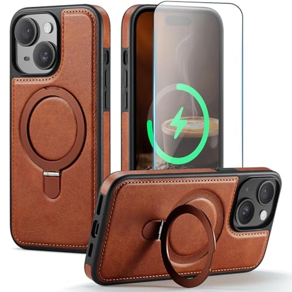 CHEEWADA for iPhone 13 Case with Stand Compatible with Magsafe Slim PU Leather & Durable TPU Drop Proof Magnetic Kickstand Protective Phone Cover with Tempered Glass Screen Protector 6.1", Brown