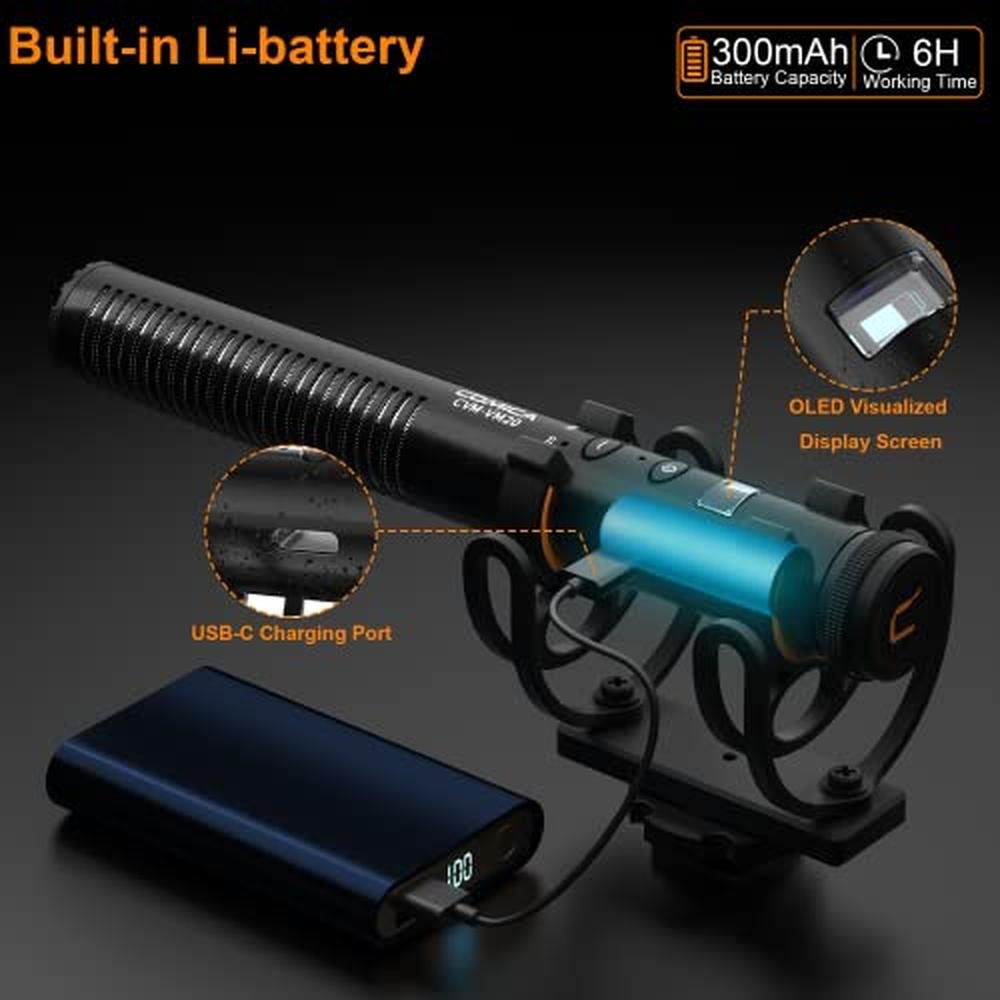 - OLED Visualized Power & Shock Absorption Design With its OLED screen, you can easily monitor the battery status and keep track of the remaining power in real-time. This ensures uninterrupted recording sessions, providing you with peace of mind. In addition, the VM20 video mic features a Rycote shock mount that effectively minimizes unwanted vibrations and shaking during motion shots. Also, you can adjust the front and rear position of the shock mount according to your need.