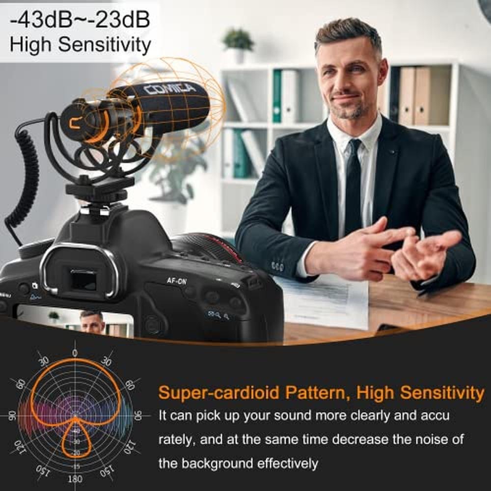 - Super-cardioid Condenser Shotgun MicAdopting the super-cardioid directional pattern, Comica VM20 shotgun microphone effectively eliminates background noise, accurately and clearly records the target sound, providing you with better recording results.