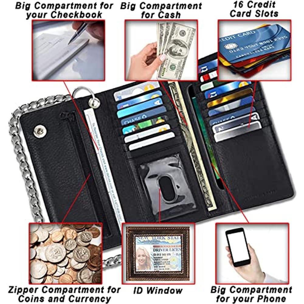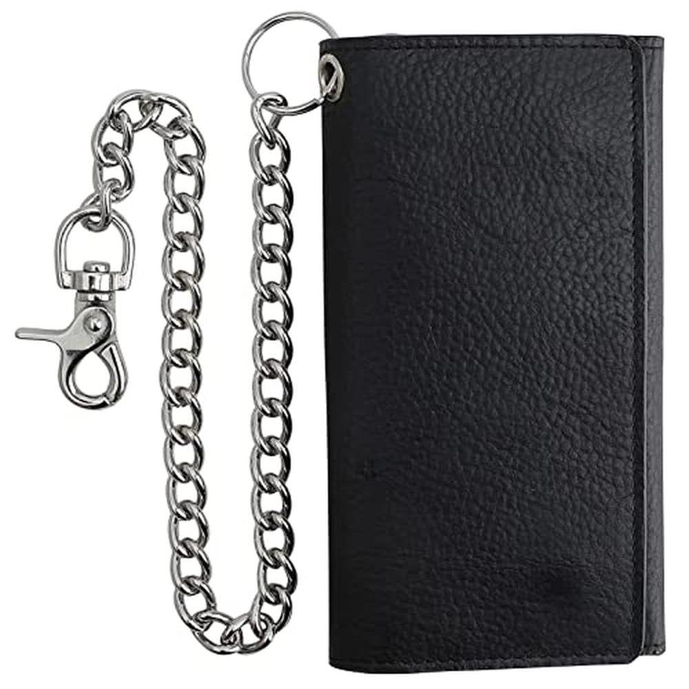 F&L CLASSIC RFID Blocking Mens Tri-fold Long Style Cowhide Leather Steel Chain Wallet,Black