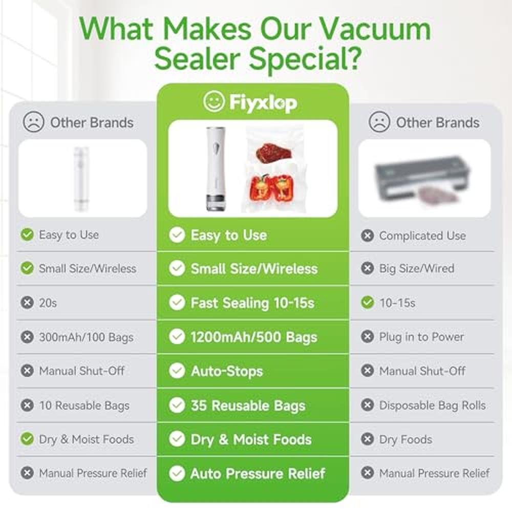 Vacuum Sealer | Fiyxlop Handheld Premium Vacuum Sealer for Food | 35 Reusable Sous Vide Bags