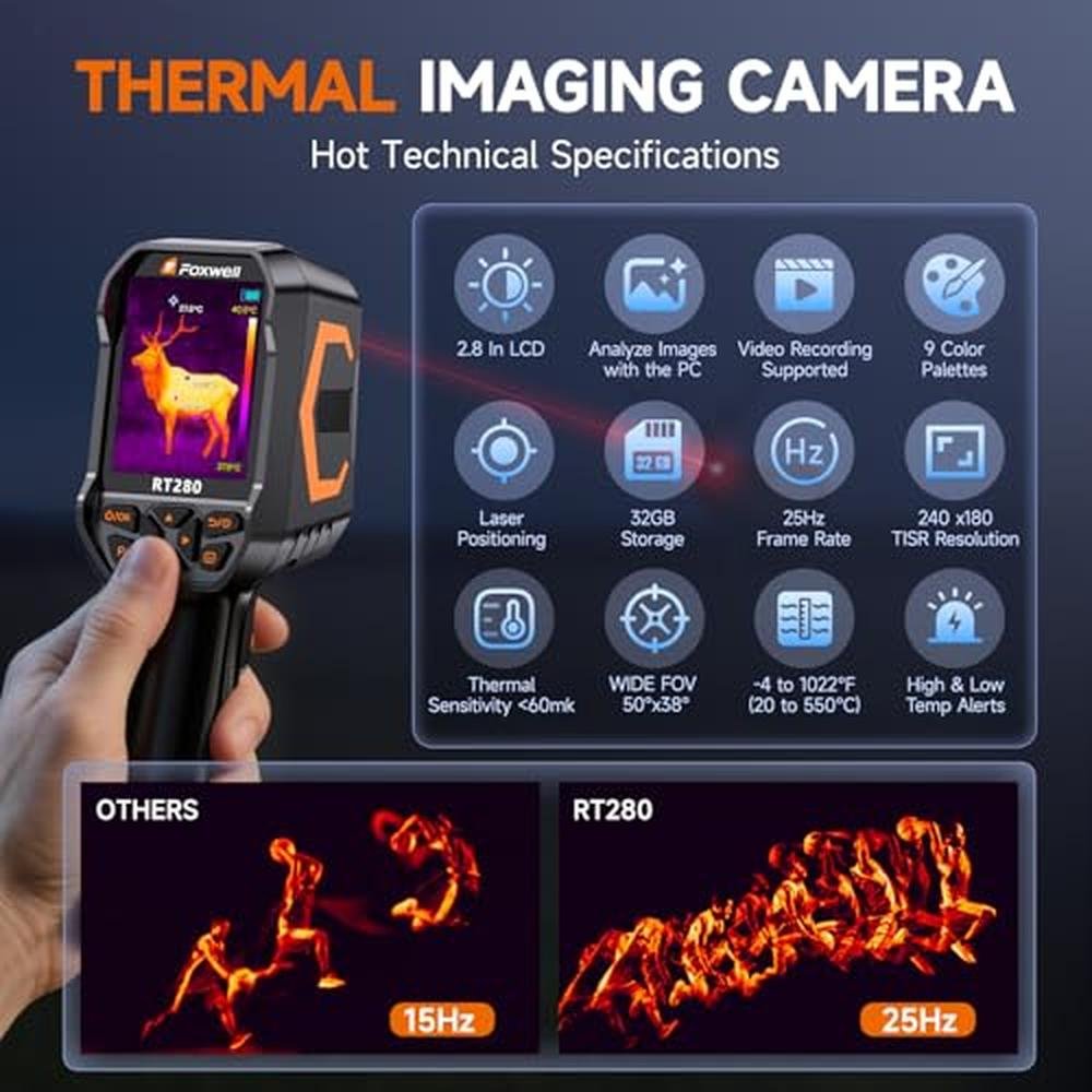 FOXWELL RT280 Thermal Imaging Camera, TISR Resolution 240 x 180 Thermal Camera with Laser, 2.8" LCD Screen, 32GB Storage, Video Recording, IP54, 25 Hz Handheld Infrared Cameras with Temperature Alarm