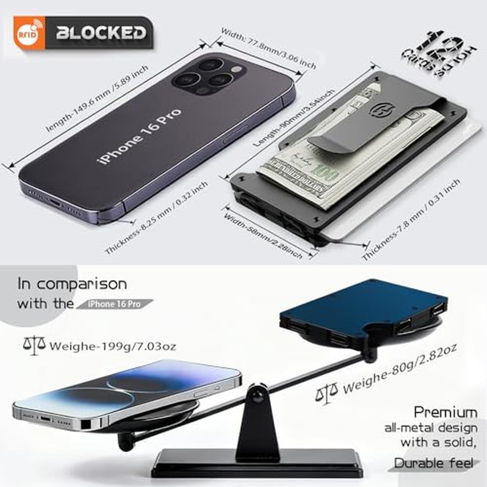 HIESGIE Minimalist Metal Card Wallet In everyday life, choosing a beautiful wallet is a great way to showcase your personal taste. This slim rfid wallet is an essential for every man who enjoys daily life. Elegant and Slim Crafted from aerospace aluminum, this wallet is designed to be both elegant and slim. It holds everything you need, without the bulk, allowing you to travel light. This minimalist wallet is suit for everyday use, whether it's for business events or casual outings, effortlessly fitting any occasion. Compact and Low Profile Measuring just 3.42 x 2.16 x 0.31 inches (87 x 55 x 7.8 mm), weight 2.82 oz (80 g), this slim metal wallet features a double sided expandable metal V design, offering a compact option for a seemingly expandable wallet. Its small size fits easily into either your front or back pocket, making it a stylish, lightweight, and convenient way to carry your essentials for both men and women. The minimalist men's wallet provides 12 card slots and space for some bills. Strong Magnetic Force Equipped with powerful magnets, this wallet ensures secure attachment to your phone or any magnetic case, the magnetic feature makes it incredibly easy to access and use, no worry about the cards falling off. Rfid Blocking Protection This metal card wallet is both discreet and equipped with rfid blocking technology. The tactical sized protection of this wallet ensures that you can go anywhere without worry, keeping your valuables and cash safe while traveling. It is ideal for travel and everyday use.