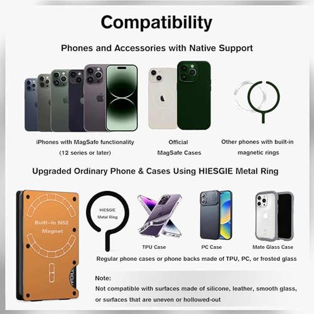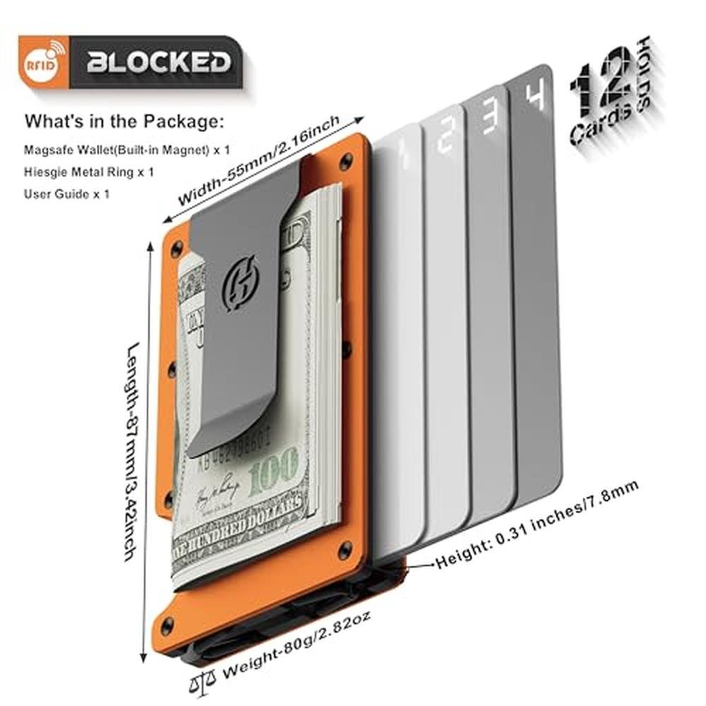 HIESGIE Minimalist Metal Card WalletIn everyday life, choosing a unique wallet is a great way to showcase your personal taste. This slim rfid wallet is an essential for every man who enjoys daily life.Elegant and Slim Crafted from aerospace aluminum, this wallet is designed to be both elegant and slim. It holds everything you need, without the bulk, allowing you to travel light. This minimalist wallet is perfect for everyday use, whether it's for business events or casual outings, effortlessly fitting any occasion.Compact and Low ProfileMeasuring just 3.42 x 2.16 x 0.31 inches (87 x 55 x 7.8 mm), weight 2.82 oz (80 g), this ultra slim metal wallet features a unique double sided expandable metal V design, offering a compact option for a seemingly expandable wallet. Its small size fits easily into either your front or back pocket, making it a stylish, lightweight, and convenient way to carry your essentials for both men and women. The minimalist men's wallet provides 12 credit card slots and space for some bills.Super Strong Magnetic ForceEquipped with powerful N52 magnets, this wallet ensures secure attachment to your phone or any magnetic case, the magnetic feature makes it incredibly easy to access and use, no worry about the cards falling off.Rfid Blocking ProtectionThis metal card wallet is both discreet and equipped with rfid blocking technology, preventing credit card theft. The tactical sized protection of this wallet ensures that you can go anywhere without worry, keeping your valuables and cash safe while traveling. It is ideal for travel and everyday use.