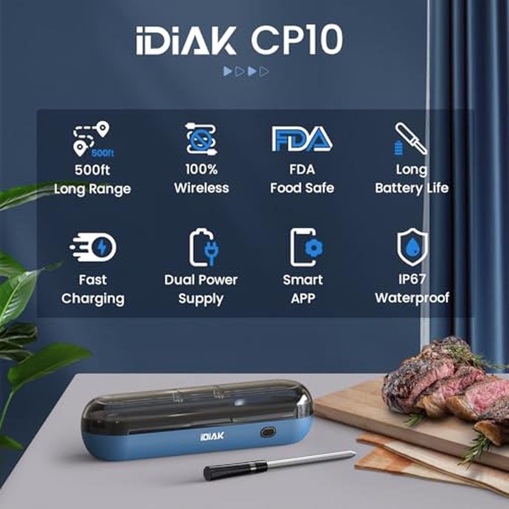 The iDiAK Wireless Meat Thermometer is designed to provide unparalleled precision and convenience for grilling and smoking enthusiasts. With its advanced features and durable construction, this device is the ultimate companion for any outdoor cooking experience. Whether you're cooking for a small gathering or a large crowd, the iDiAK CP10 Smart Wireless Meat Thermometer is the perfect tool to ensure your meats are cooked to perfection every time.