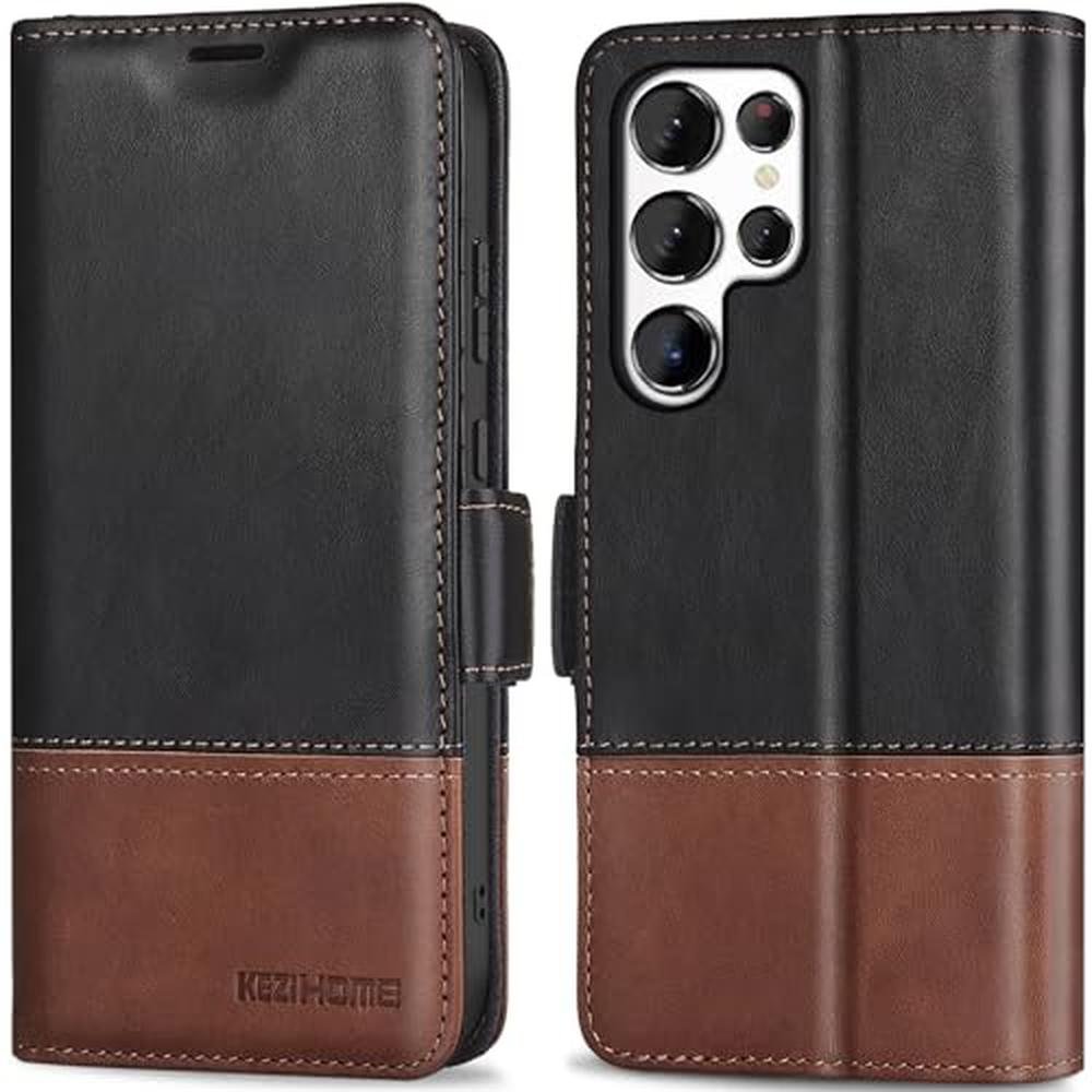 Experience the ultimate blend of style, protection, and functionality with the KEZiHOME Samsung Galaxy S24 Ultra case, expertly designed for the Samsung S24 Ultra phone. Crafted from premium genuine leather, this S24 Samsung phone case boasts advanced RFID blocking technology, ensuring your personal information remains secure and protected. The sleek and sophisticated design features a convenient card slot and kickstand, providing an effortless way to watch videos or make hands-free calls. Compatible with the Samsung Galaxy S24 Ultra, this top-tier protective phone cover is available in two elegant colors: black and brown. Whether you're looking for a reliable S24 Samsung case or a functional S24 Samsung wallet case, the KEZiHOME Galaxy S24 Ultra case is the ideal choice, offering superior protection, advanced functionality, and unparalleled style for your S24 Samsung phone.