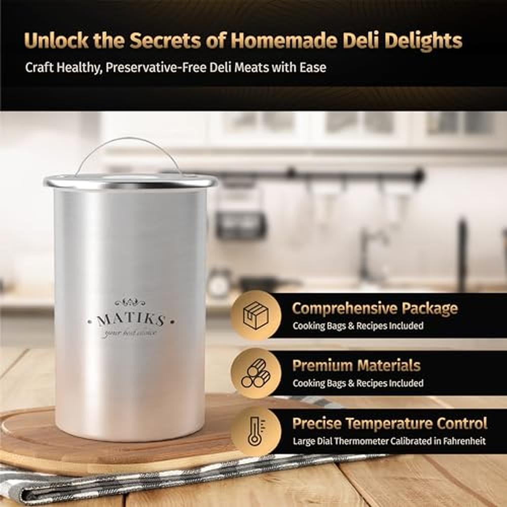 - The included bonus thermometer, recipes, and cooking bags ensure a perfect result every time, making it easy to create a variety of deli meats at home, from mouthwatering sandwiches to gourmet bacon strips.