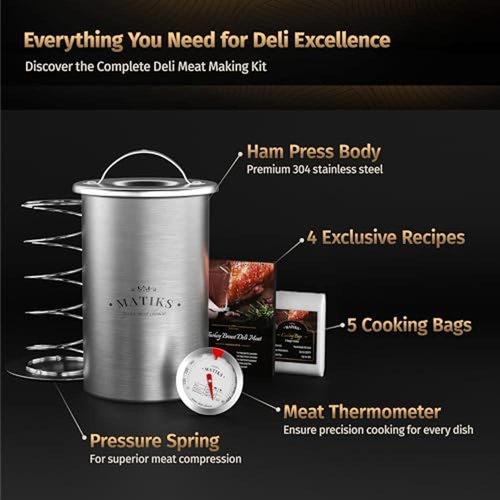 Experience the ultimate in culinary control with the Matiks Deli Meat Press Mold, a premium stainless steel lunch meat press maker that empowers you to craft your own healthy homemade ham. Unlike store-bought deli meats, our ham maker allows you to select the finest ingredients and avoid potential deli meat carcinogens, making it an excellent option for those concerned about deli meat while pregnant or seeking a superior alternative. With our deli meat press, you can effortlessly create a variety of deli meats at home, and the included bonus thermometer, recipes, and cooking bags ensure a perfect result every time. Whether you're looking for a deli meat slicer for home or simply want to explore different deli meat brands and options, the Matiks Deli Meat Press Mold is the perfect solution.