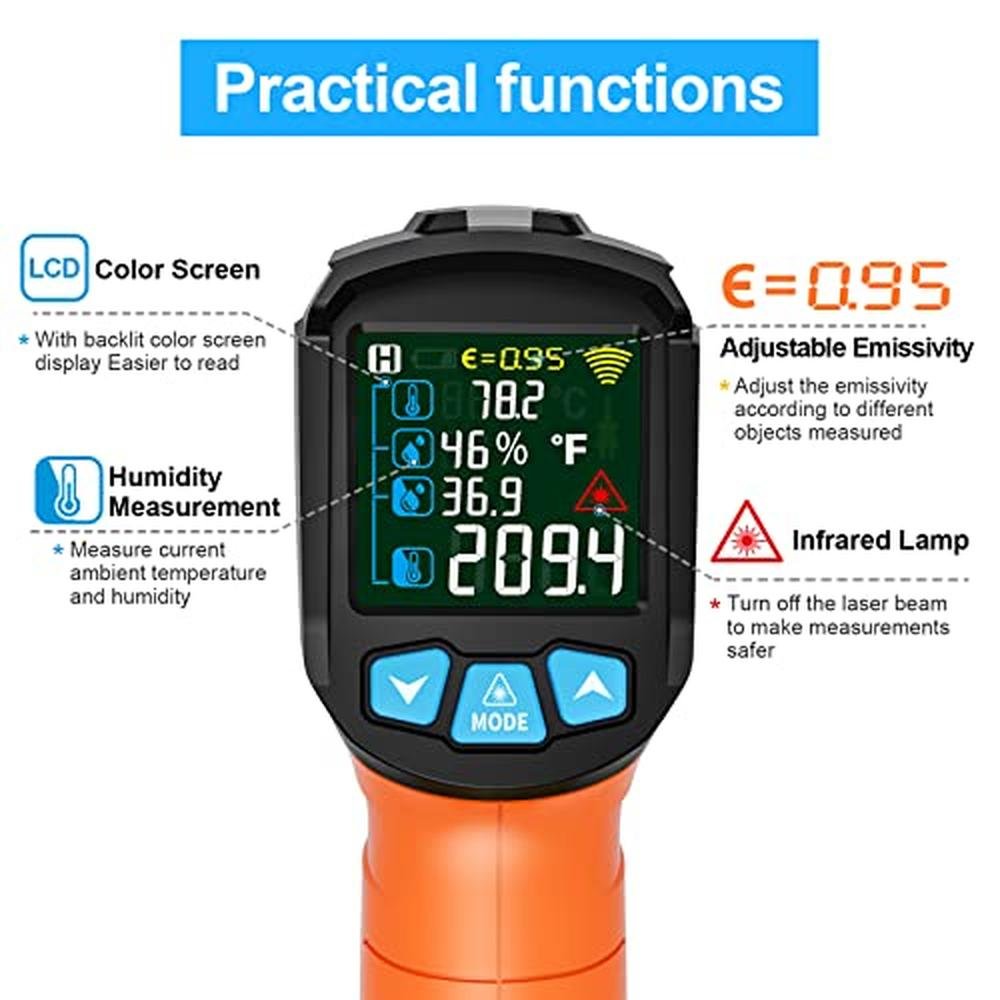 Experience the pinnacle of temperature measurement accuracy with the MESTEK Infrared Thermometer Gun, a premium, high-end, non-contact digital laser thermometer designed for precise readings in various applications, including cooking, home repairs, and humidity measurement. This sophisticated, top-tier thermometer gun boasts an adjustable emissivity feature and a wide temperature range of -58F to 1472F (-50~800C), making it an indispensable tool for professionals and DIY enthusiasts alike. The color LCD display provides crystal-clear visibility, ensuring that you can rely on accurate readings for your pizza oven, food, or other household needs. Whether you're a discerning homeowner, a skilled chef, or a seasoned handyman, this exquisite, world-class thermometer gun is the ultimate solution for all your temperature measurement needs.