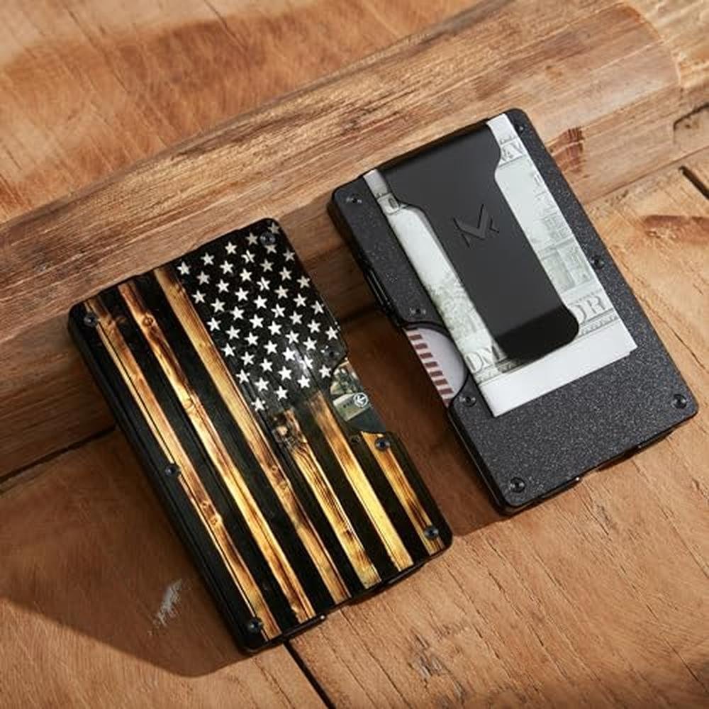 MIFANYO Modern Metal Wallet for Men Stands the Test of Time At MIFANYO, we are experts in creating wallets that have been proven to withstand the test of time. The smart metal wallet made of aluminum plate is thin, but the high-strength metal makes the slim wallet for men very rugged. Convenient for Use Measuring just 3.48'' x 2.17'' x 0.32'', only 2.9OZ, matte black. This minimalist wallet for men can easily fit into front pockets. The special metal plate can block RFID Chip Readers very well, dont worry about accidental or malicious intrusion to the rfid wallet. Travel Essentials With its unique three-sided expandable metal "V" design, this wallet can effortlessly accommodate 12 cards and 6 bills. Its special C-type card slot allows you to easily push out the cards you want. Besides, there is stainless steel removable money clip is convenient for carrying cash, cheques, etc. Whether for daily errands or long journeys, this wallet for men adjusts to your needs. Special Choice for Men MIFANYO minimalist wallet is very suitable for daily use in various occasions, whether it is business activities or outdoor leisure, it can be easily controlled. Perfect for sons, husbands, fathers or male friends. It's not just a wallet, it's an experience, making it an ideal gifts for moments like Christmas, Birthdays, Valentines, Anniversaries, Fathers Day, graduations, thanksgiving day, wedding, and more.Honoring the US Army, USA Gifts for Soldiers Veteran. Let's make His Day special with this unique personalized usa flag card case! Purchase without Worry If you have any other questions for the money clip, we will resolve it for you as soon as possible.
