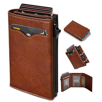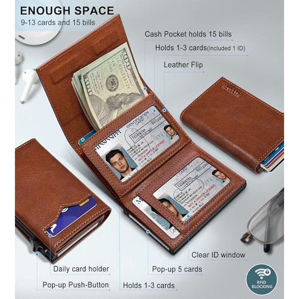 - AMPLE SPACE--This men's wallet Stores 9-13 cards and 15 bills total.The pop-up aluminum card holder stores 5 cards,Leather Interior holds up to 7cards and cash slot stores 15bills,Exterior 1 daily card holder.
