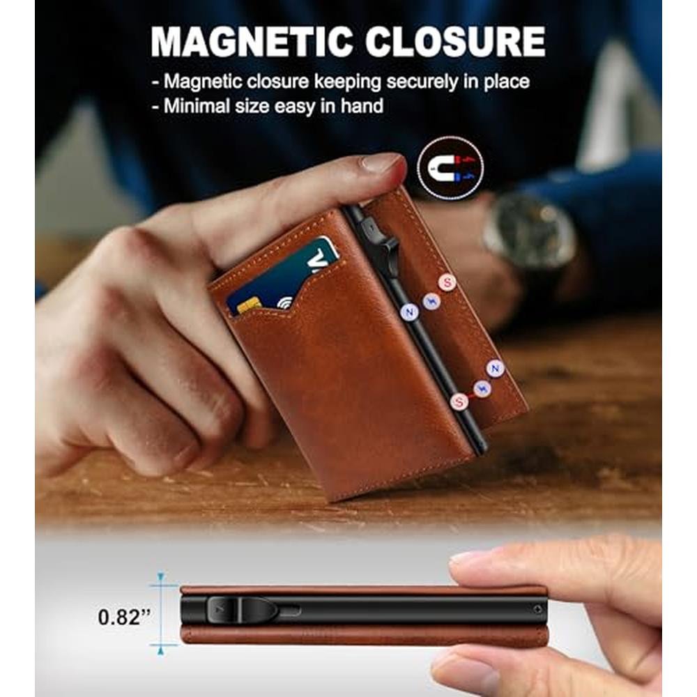 miyozi Wallet for Men,with Cash Pocket 2 ID Window 9-13 Cards,Metal Case Smart Slim Pop Up Credit Card Holder Flip with Magnetic Closure RFID Blocking Trifold wallet with Gift Box