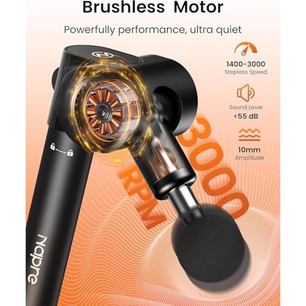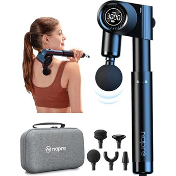 Explore the advanced features of the Napre Foldable Massage Gun, including its quiet brushless motor, 10mm amplitude, and 0.9-inch LED screen. The 2500mAh battery supports over 3 hours of continuous use and features 15W PD fast charging for a full recharge in just 2.5 hours. Complete with 5 specialized massage heads and a premium carrying case, it's the ultimate all-in-one portable kit for athletes, travelers, and anyone seeking professional-grade relief anytime, anywhere.
